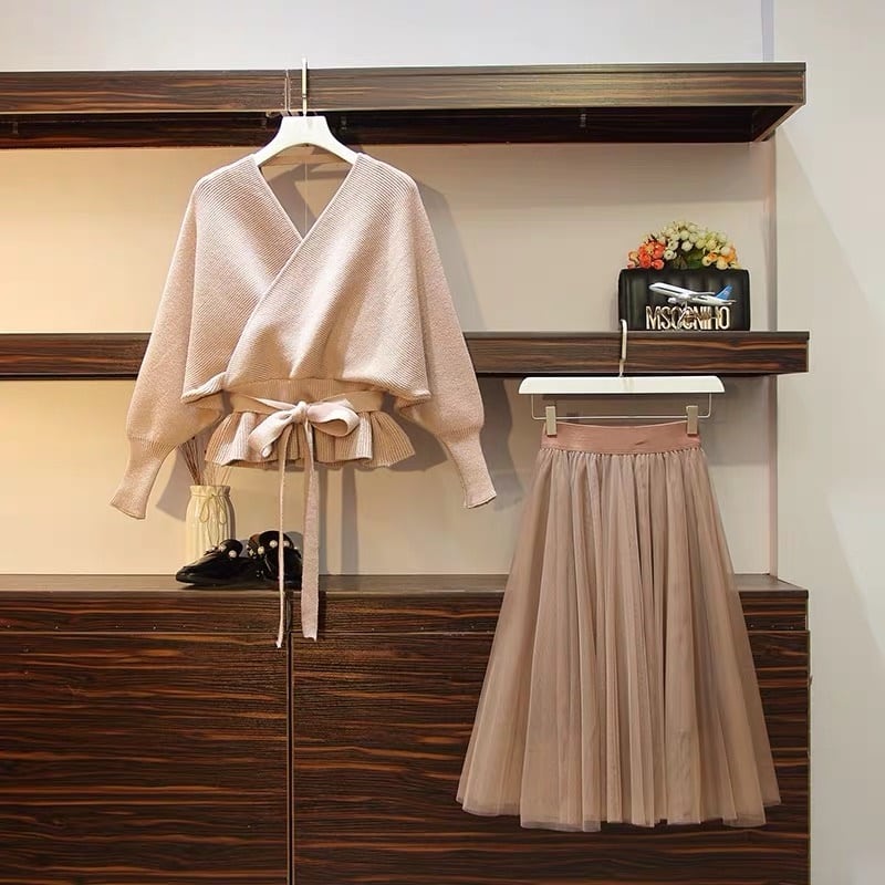 【 国内発送 s051 】ゆったり Vネック カシュクール ニットセーター+チュールスカート リボン ボウタイ 上下 セットアップ 大きいサイズ 4L 5L 6L 韓国 ファッション