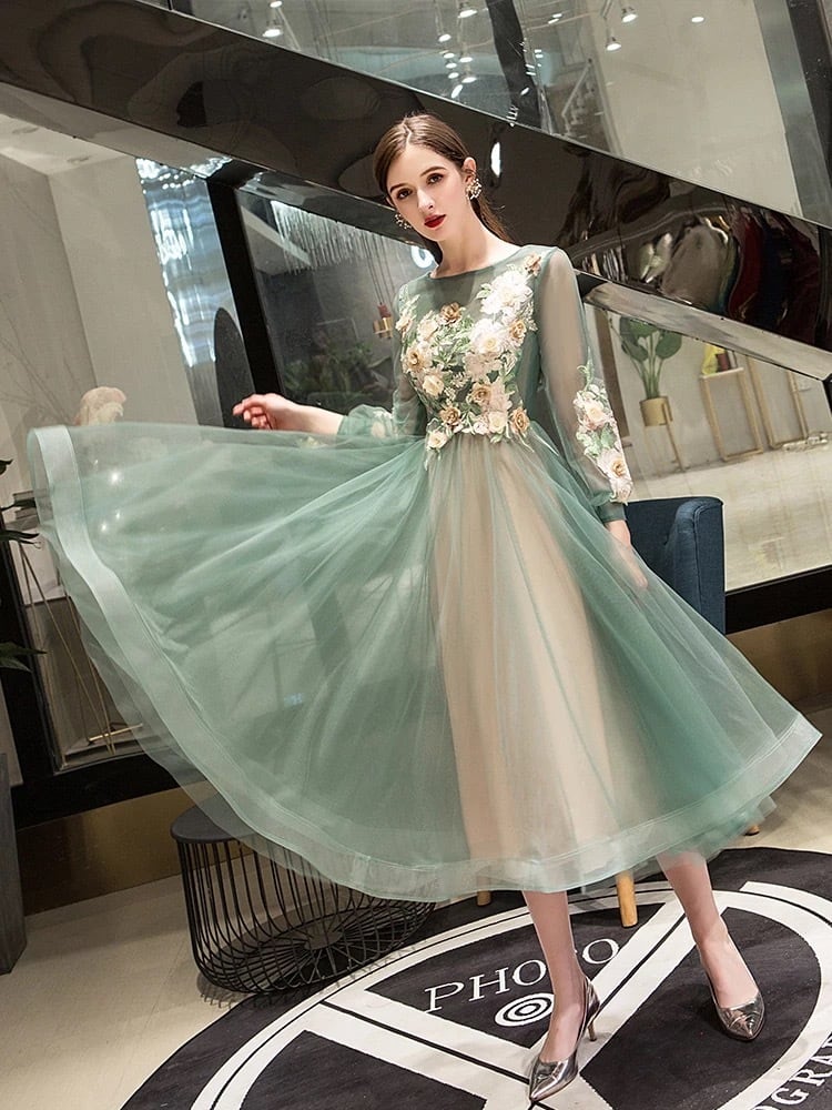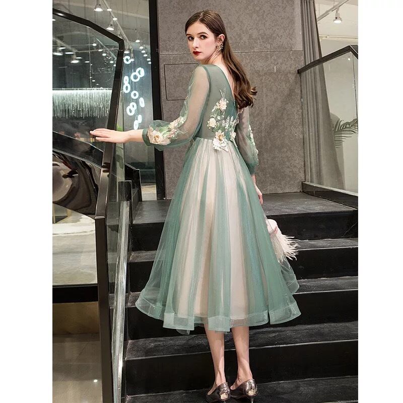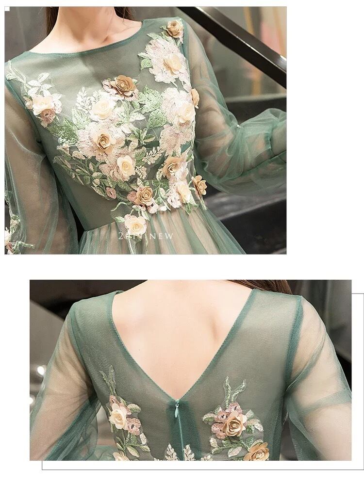 【 送料無料 国内発送 d014】ミモレ丈ワンピース 刺繍ワンピース ロングワンピース チュールワンピース 結婚式ワンピース 結婚式ドレス 二次会 パーティードレス グリーン 発表会 演奏会 デイリー