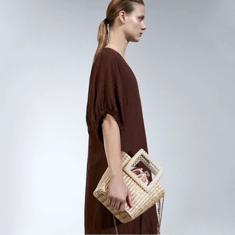 持ち手がパールで春夏にぴったりのカゴバッグです。