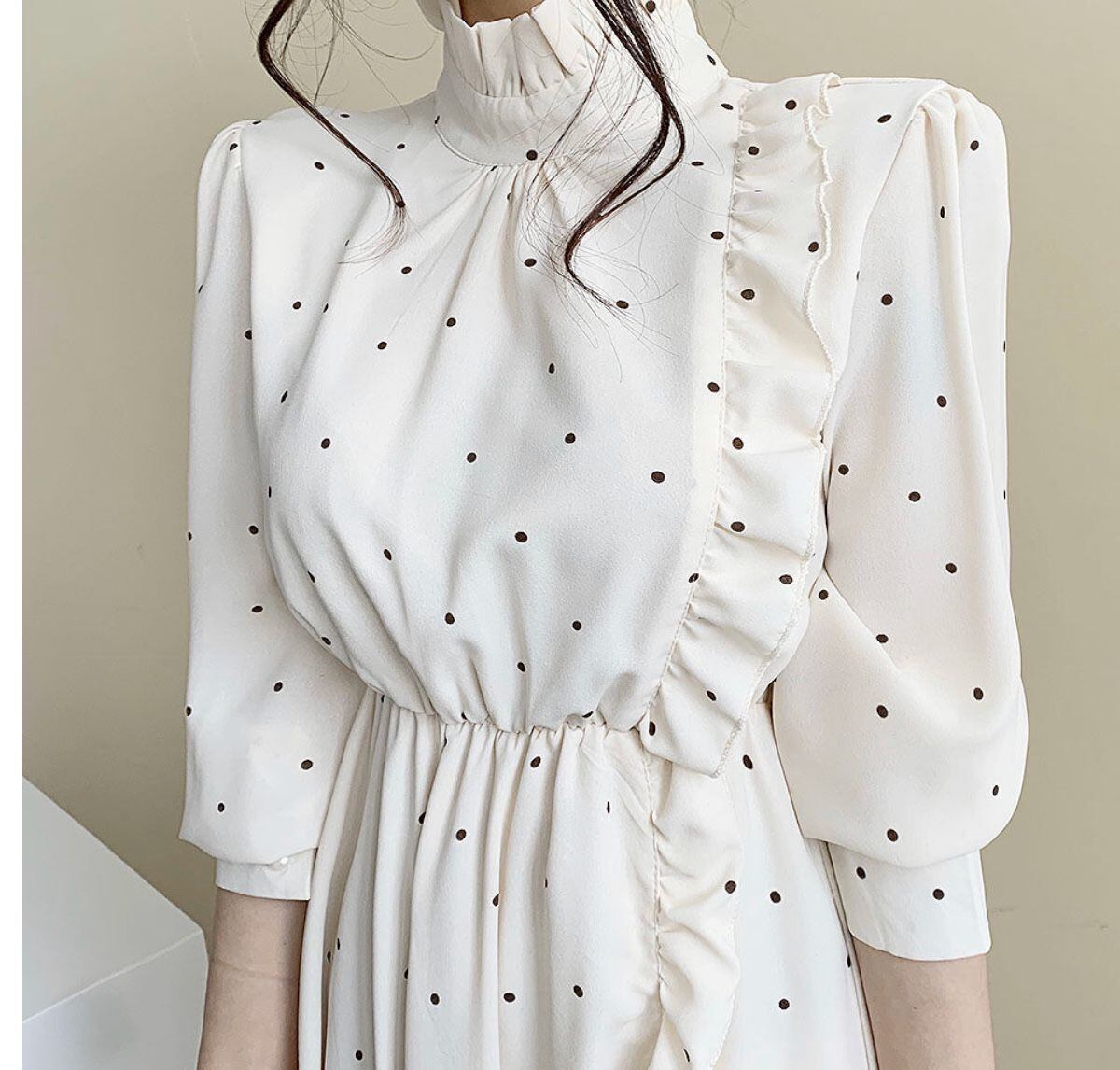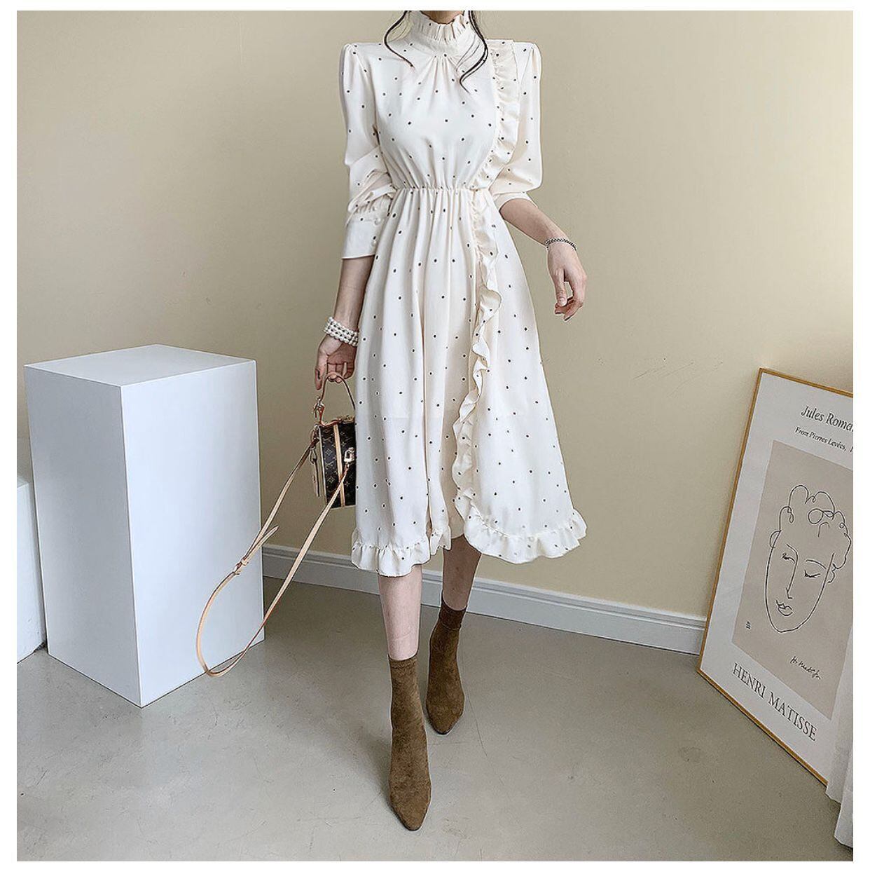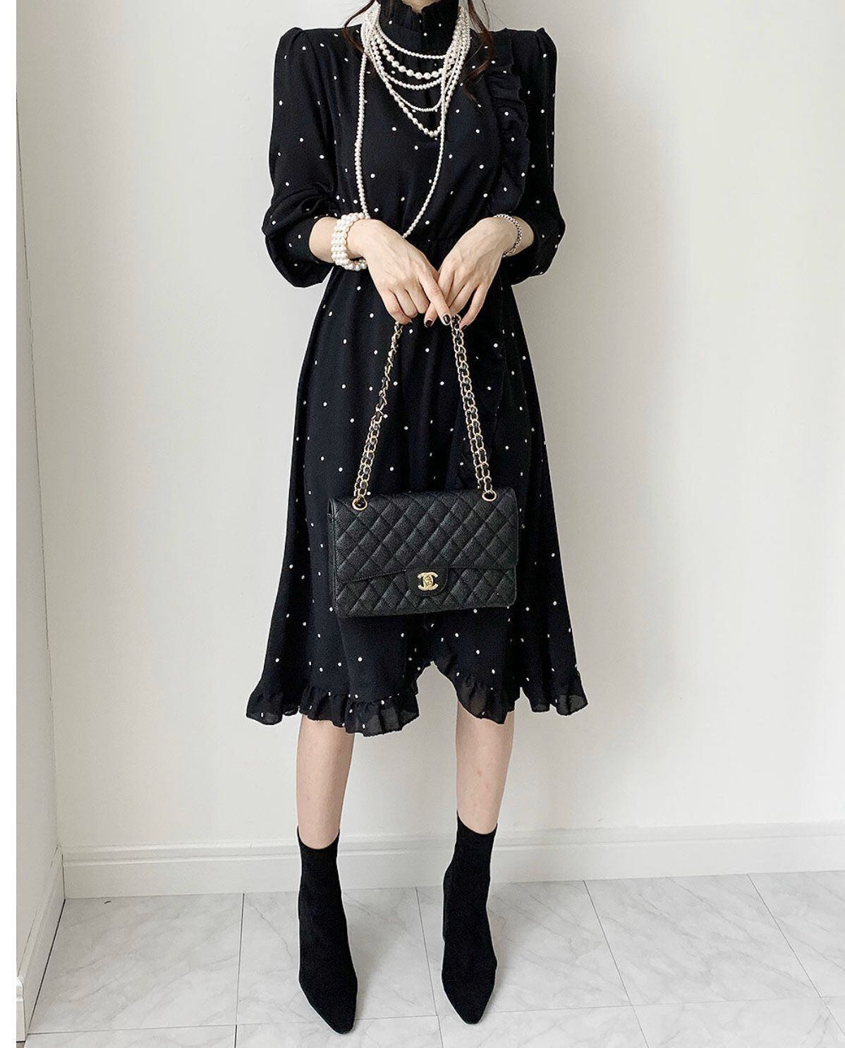 【 送料無料 国内発送 d024 】ハイネックワンピース ワンピース ロング ワンピースドレス ロング丈ワンピース ロング袖 ブラック ホワイト ドット柄
