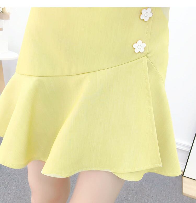 シースルーブラウスと花ボタンが可愛いセットアップです。