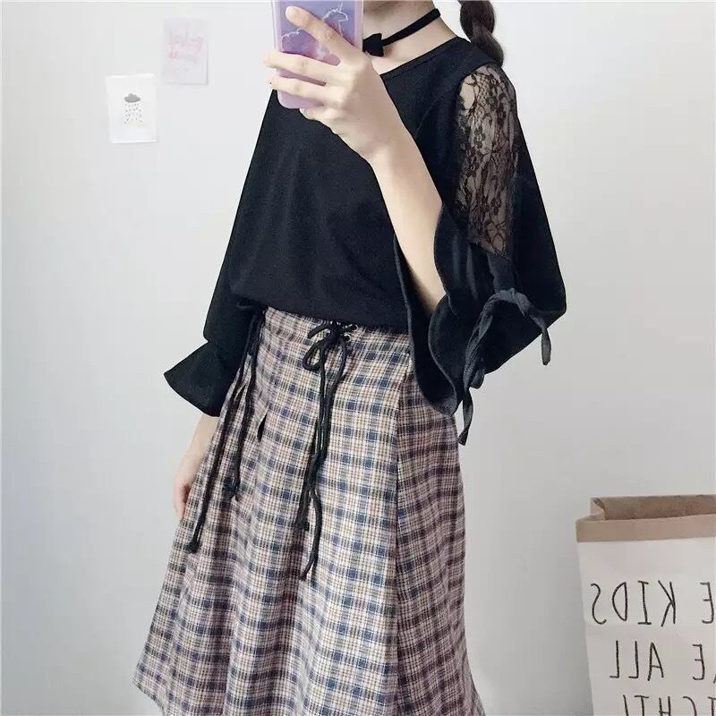 【 国内発送 s007 】レース袖トップス&チェック柄スカートセットアップ 大きいサイズセットアップ 大きいサイズ韓国 大きいサイズ専門店 レース チェック柄