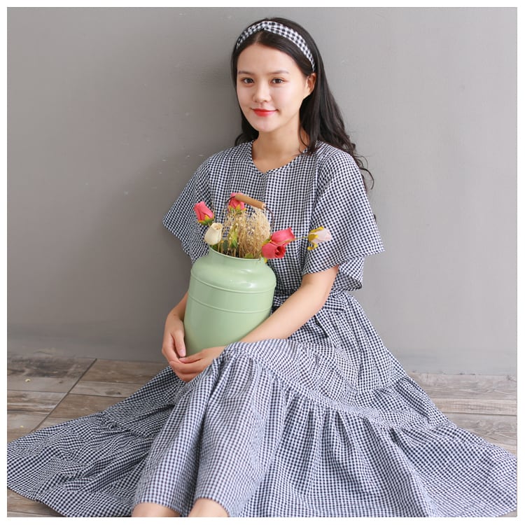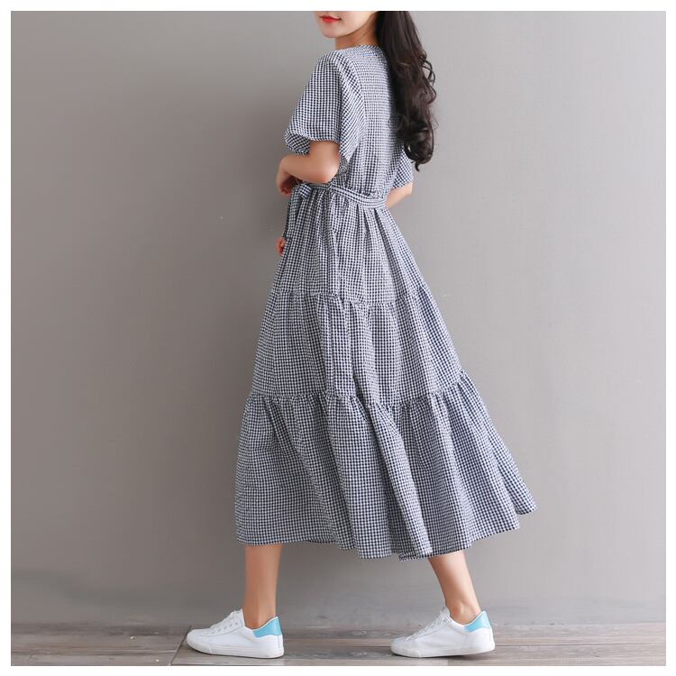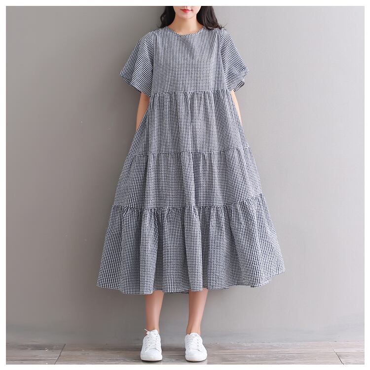 【 国内発送 大きいサイズあり d040 】Aラインチェック柄ワンピース 半袖チェック柄ワンピース ミモレ丈ワンピース 大きいサイズワンピース 安い レディース通販