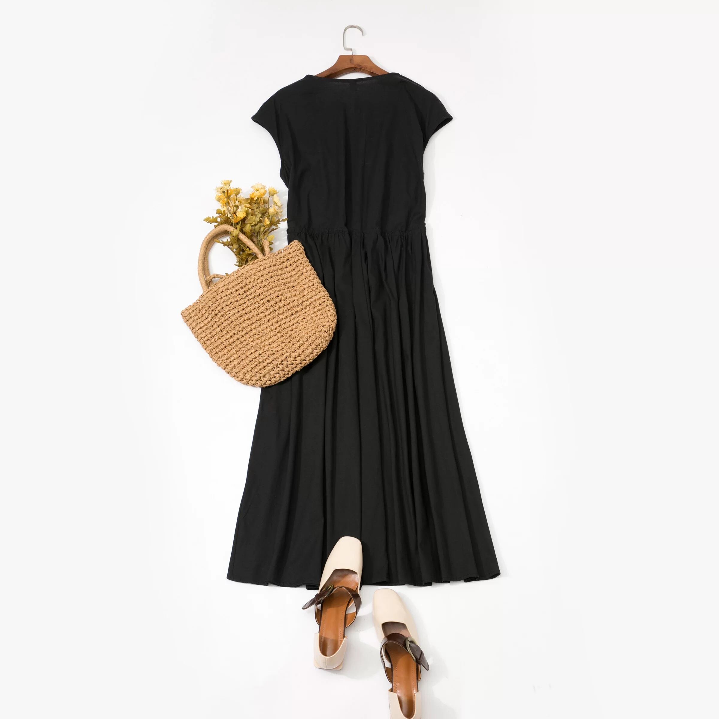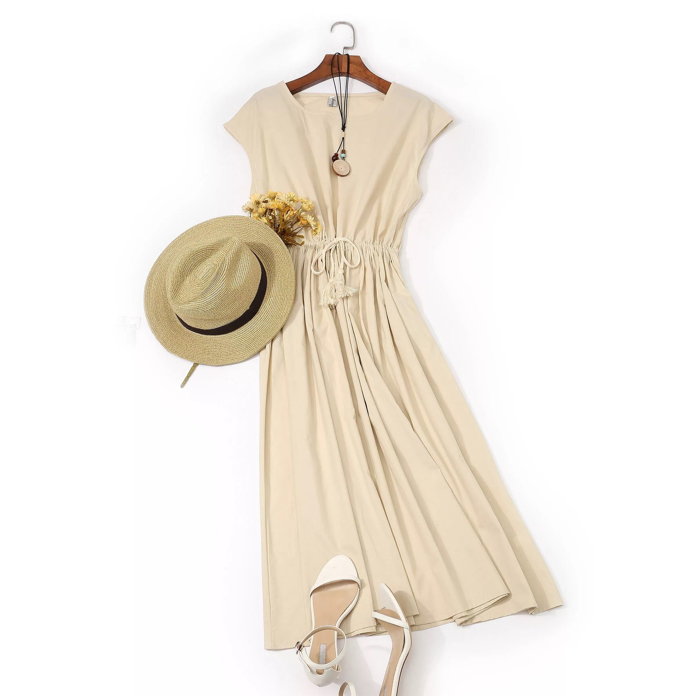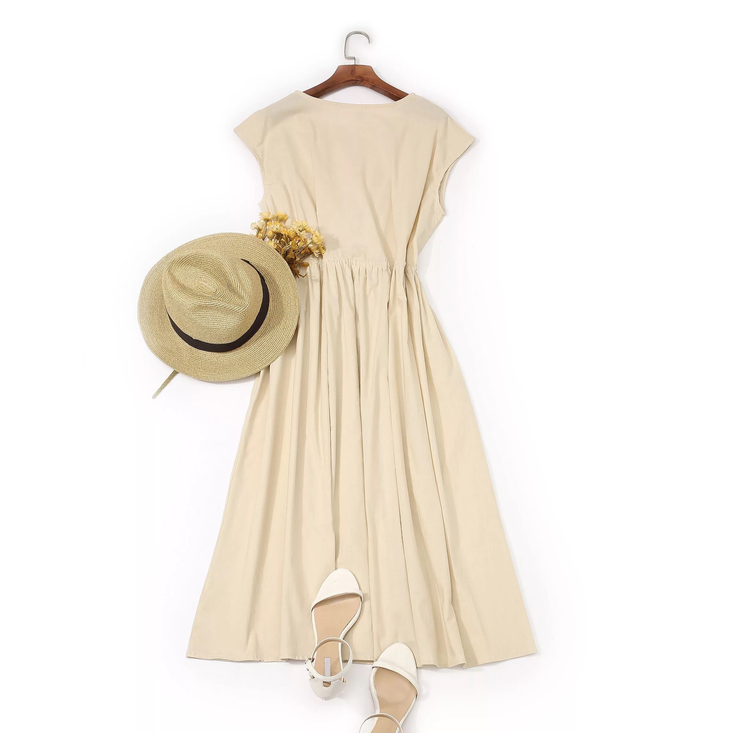 【 国内発送 d044 】ナチュラルロングワンピース ロングワンピース コットンワンピース 綿ワンピース 体型カバーワンピース ベージュ アイボリー ブラック ネイビー イエロー カーキ
