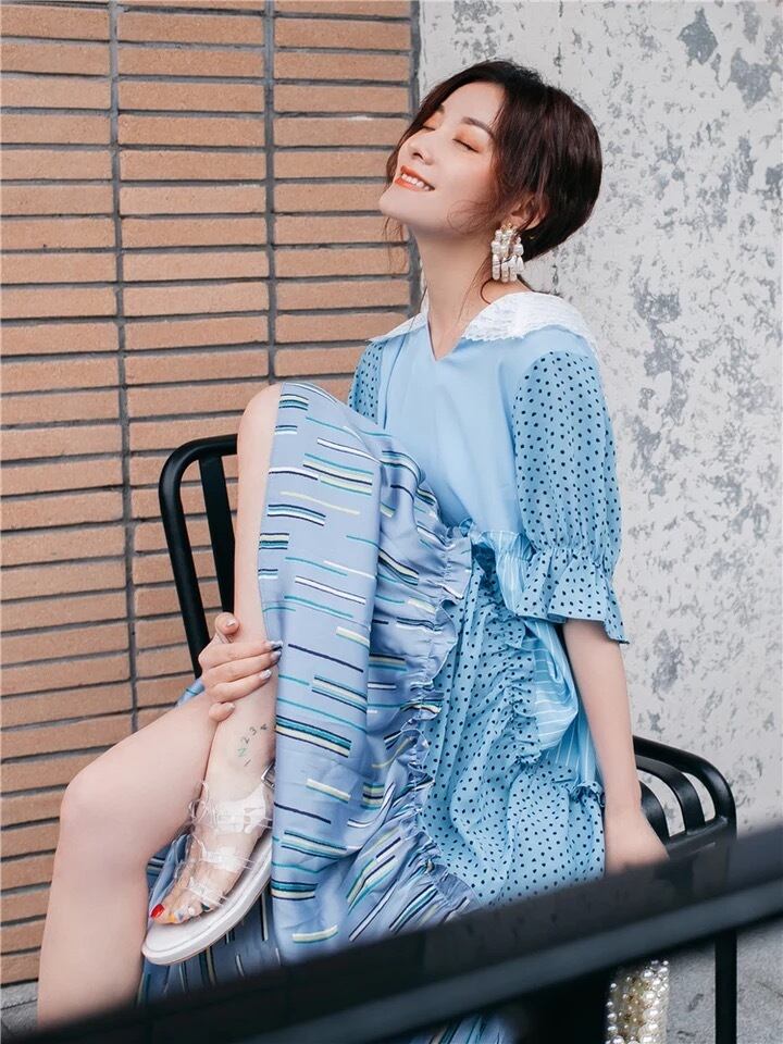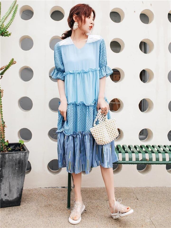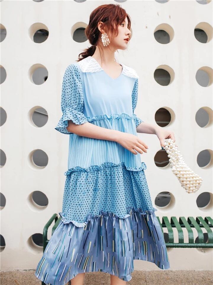 【 国内発送 d053 】カラーミックスワンピース ミモレ丈ワンピース 水玉ワンピース ストライプ柄ワンピース 袖あり 襟付きワンピース 大きいサイズワンピース レース襟 S M L 2L