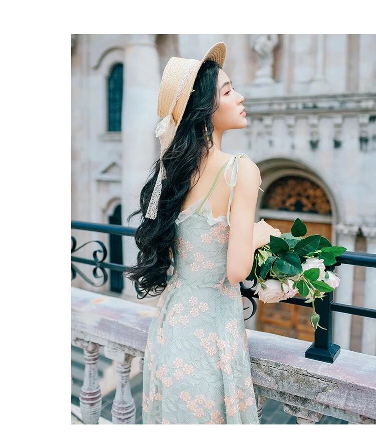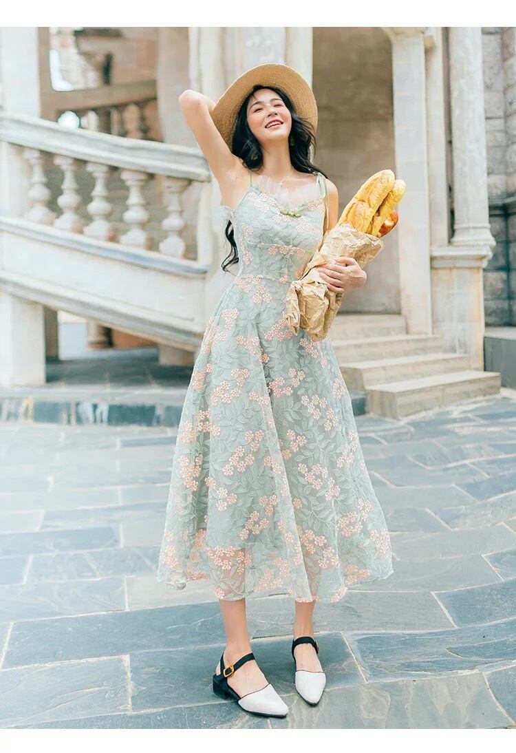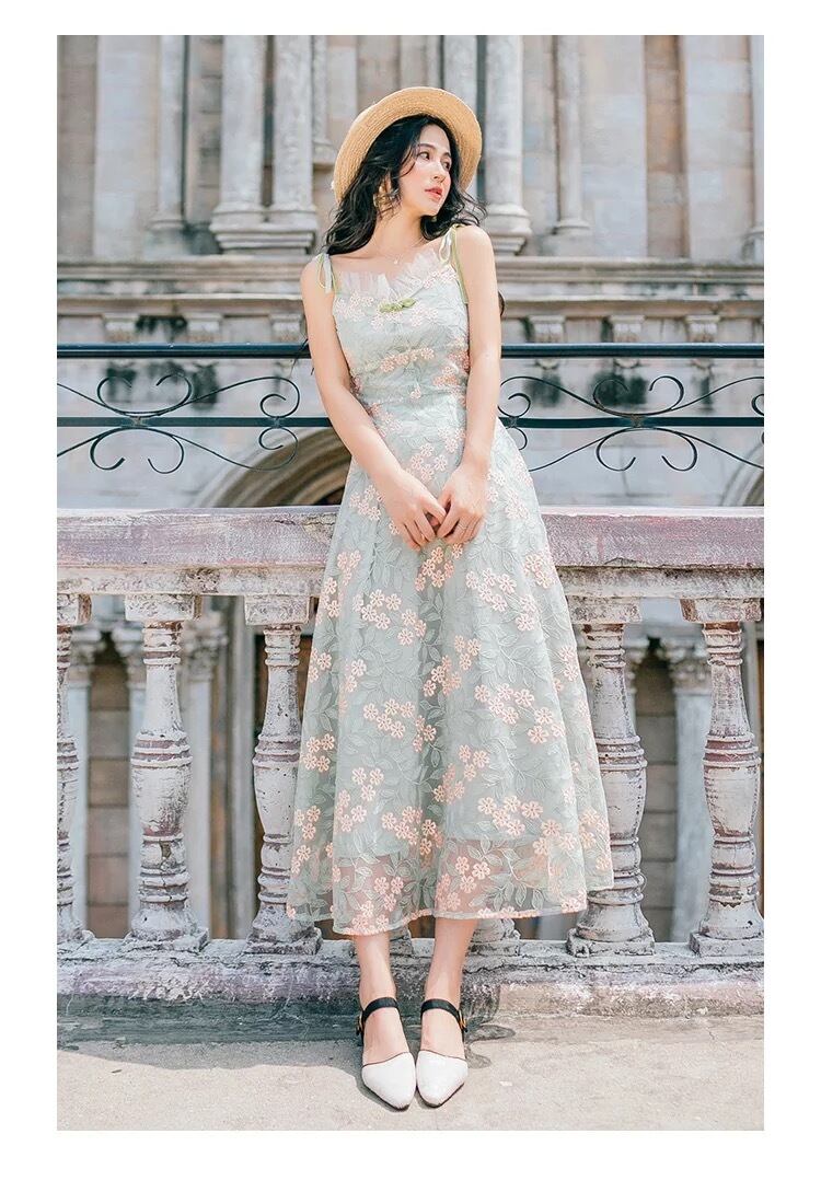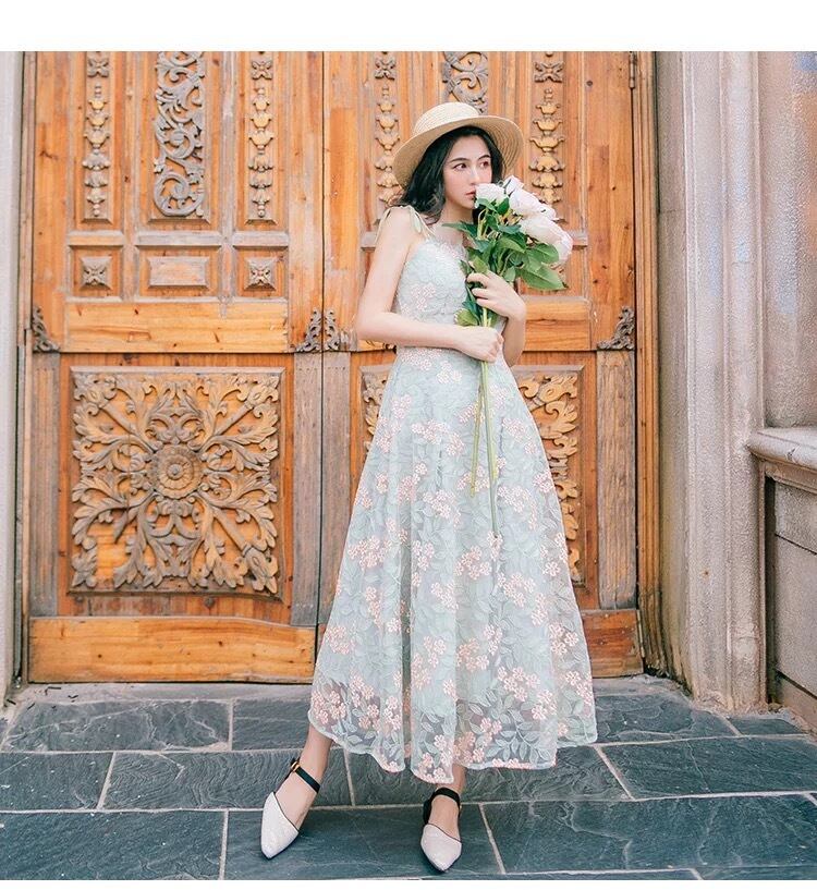 【 国内発送 d058 】花柄刺繍キャミワンピース ロングワンピース 刺繍ワンピース 花柄ワンピース キャミソールワンピース ミントグリーン