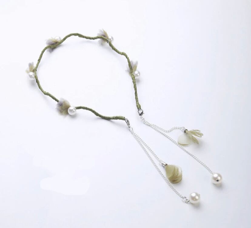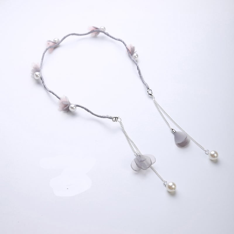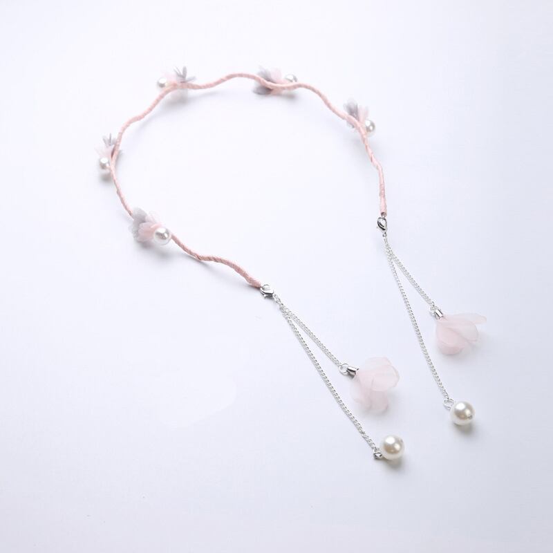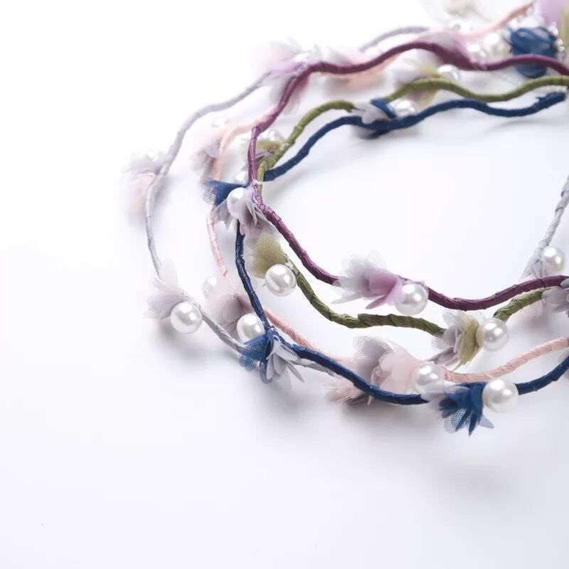花モチーフとパールで仕上げた取り外し可能なチャーン付き細めカチューシャ。