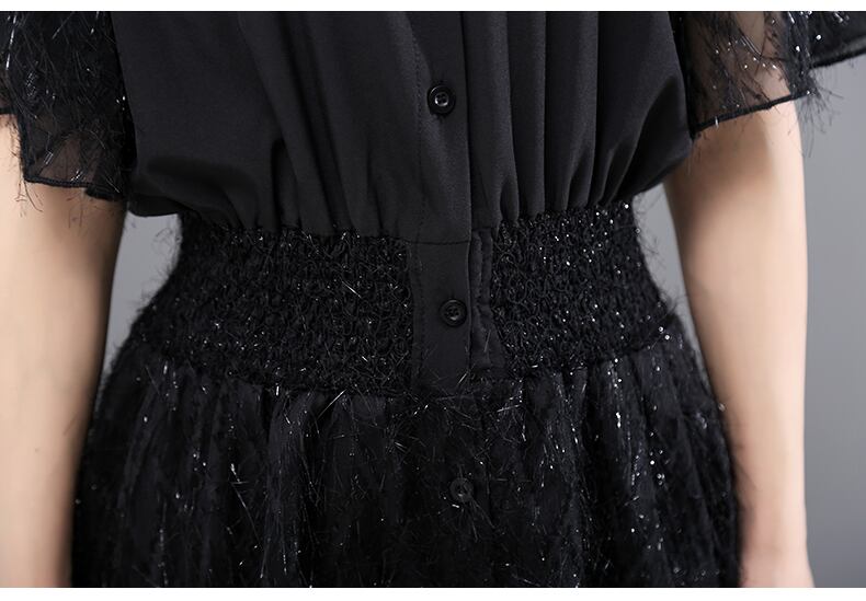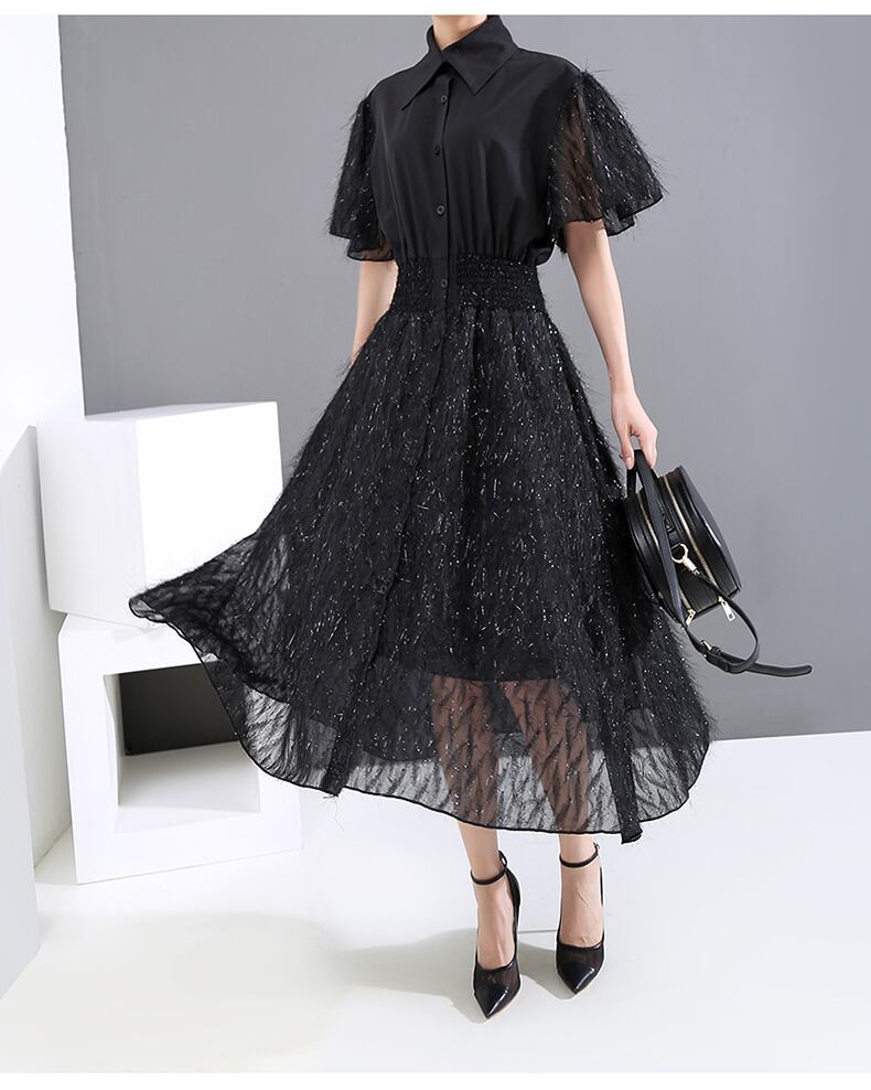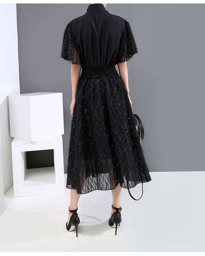 【 国内発送 d070 】ラメミディアムワンピース ミモレ丈ワンピース ラメ ブラック 襟付きワンピース 韓国ファッション ロングワンピース
