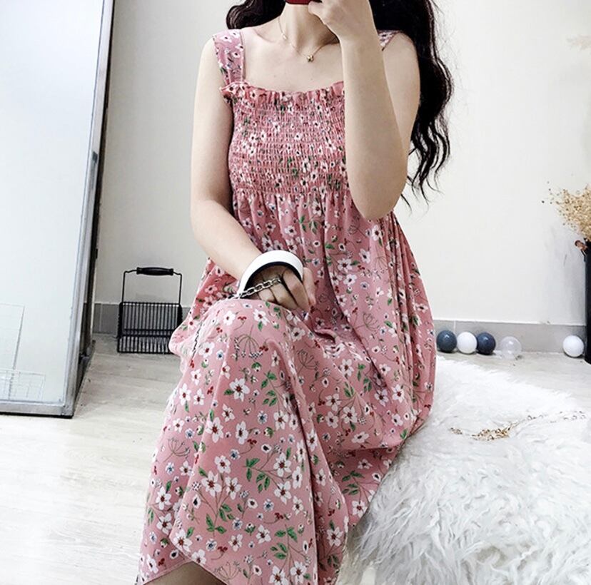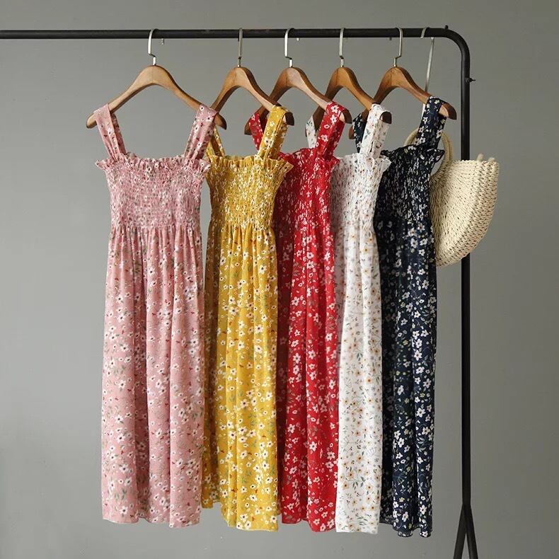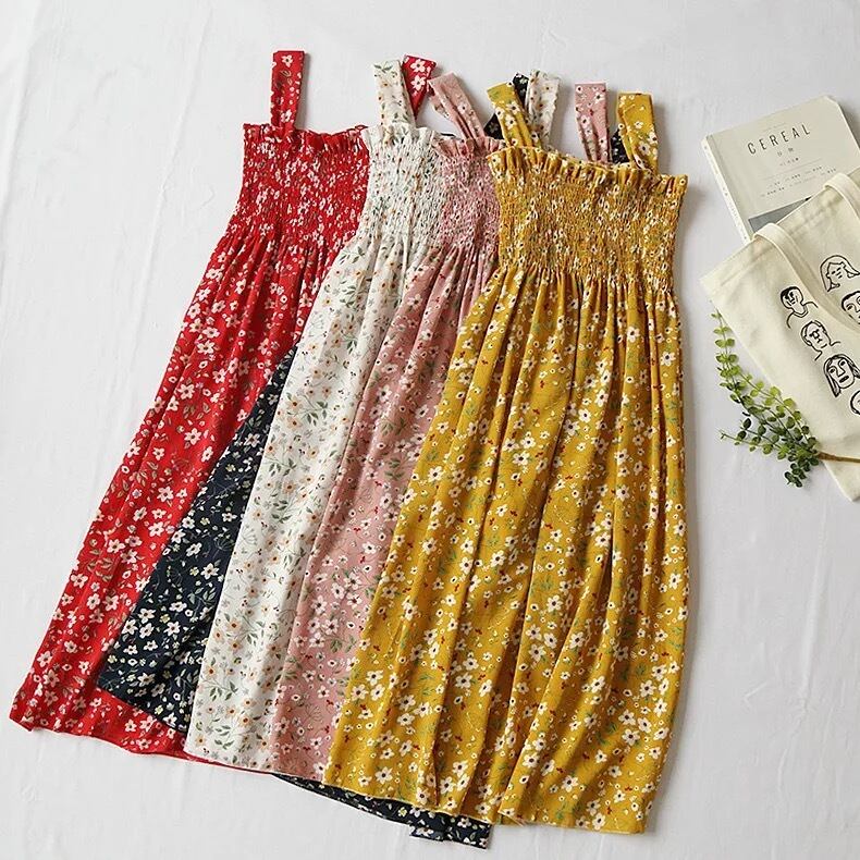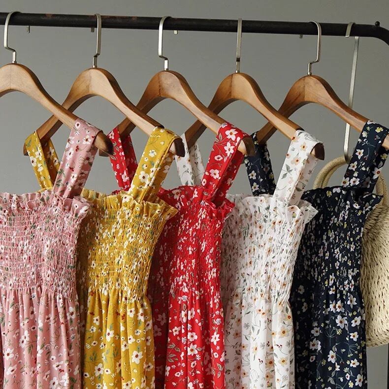 【 国内発送 d072 】シャーリングワンピース 花柄ワンピース ロングワンピース 小花柄 ピンク イエロー ホワイト ネイビー レッド