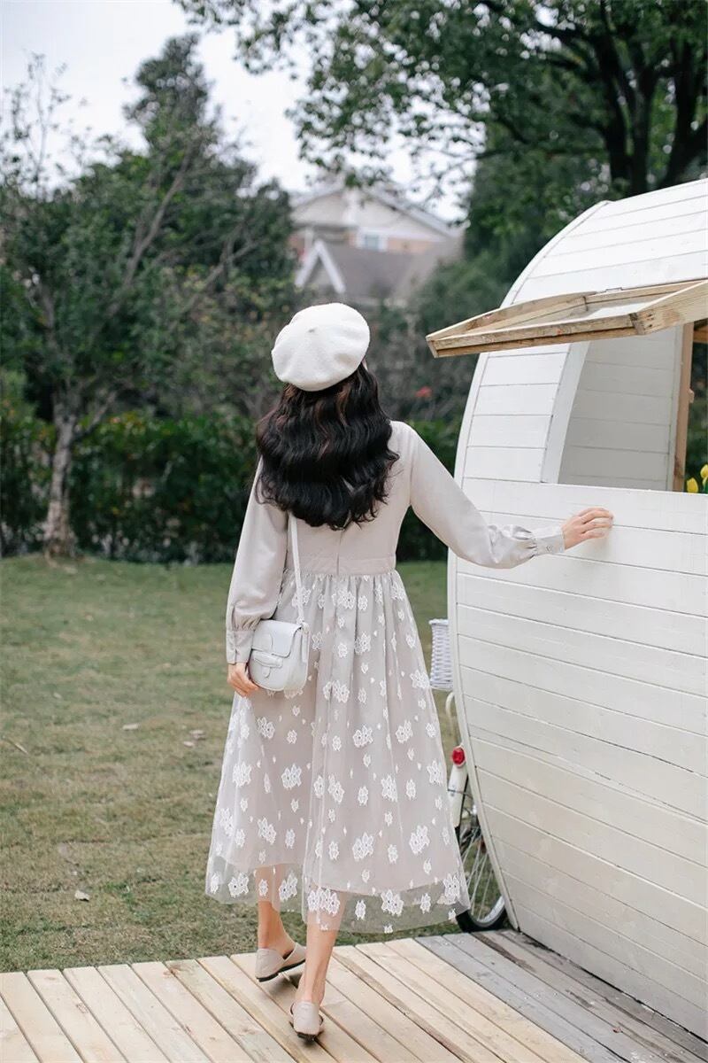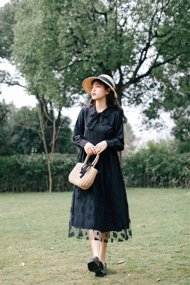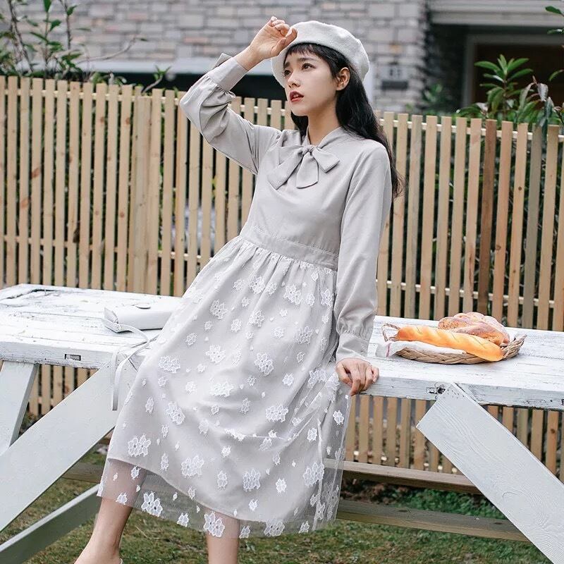 【 国内発送 d079 】ボウタイリボンワンピース 長袖ワンピース ロングワンピース 上品 お呼ばれ デート