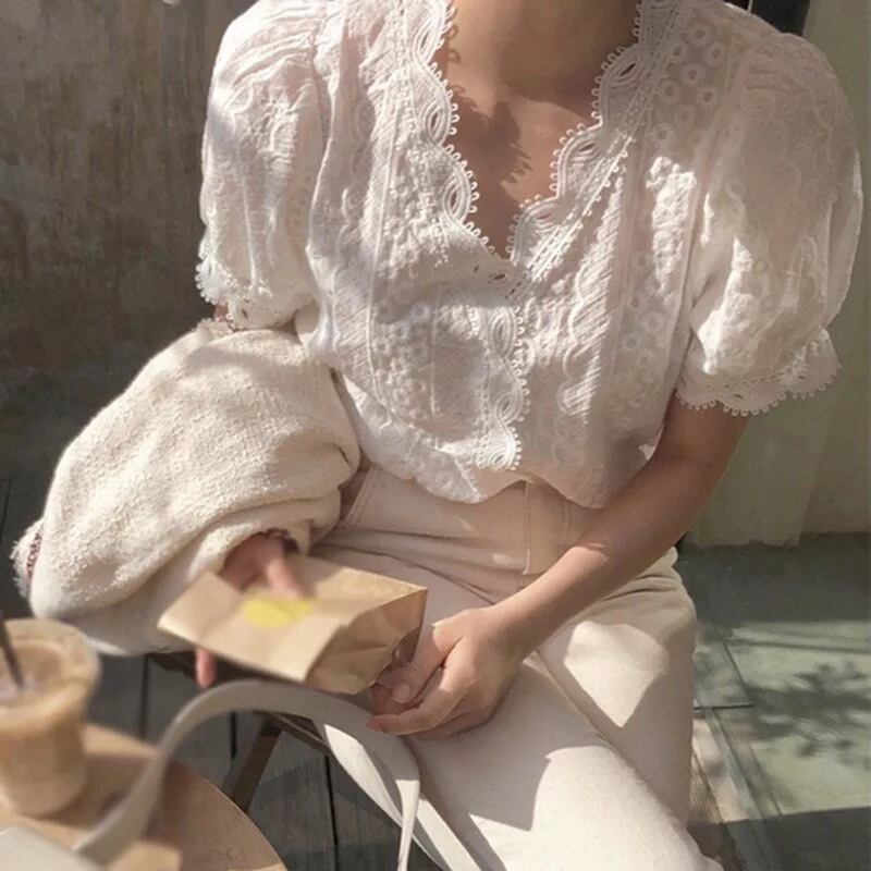 【 国内発送 t019 】レースブラウスシャツ 半袖シャツ ホワイト ブラウス