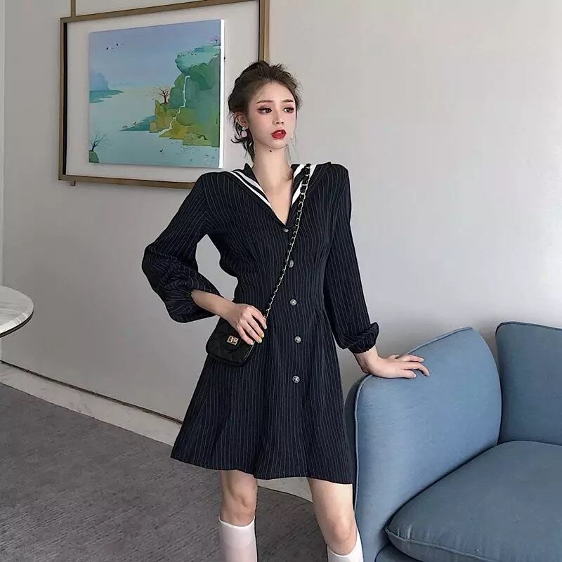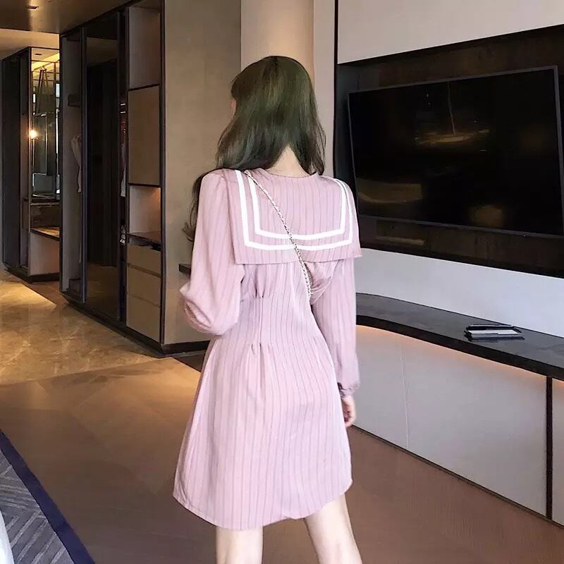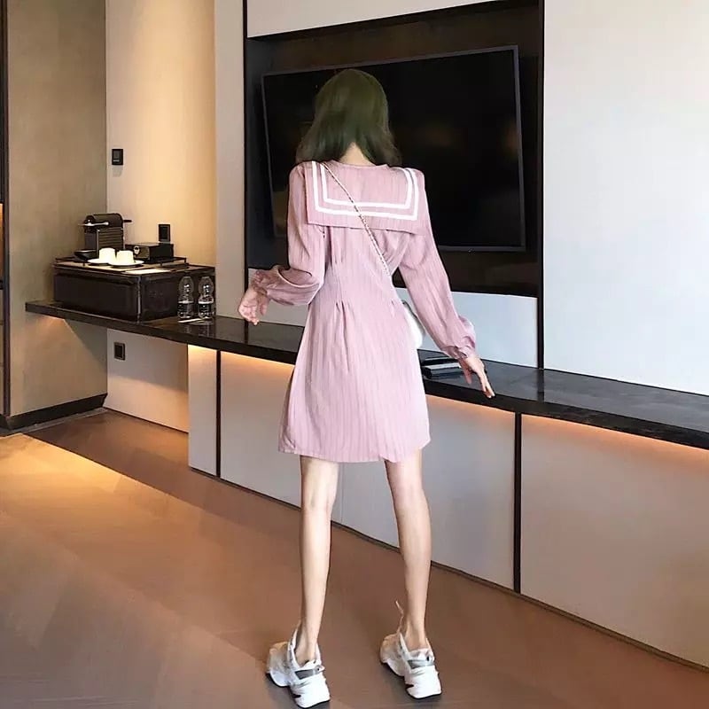 【 国内発送 d087 】セーラー襟ワンピース セーラーワンピース 大きいサイズあり ワンピース ミニ丈 ストライプ柄 着痩せ効果