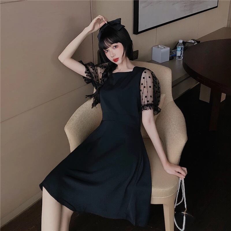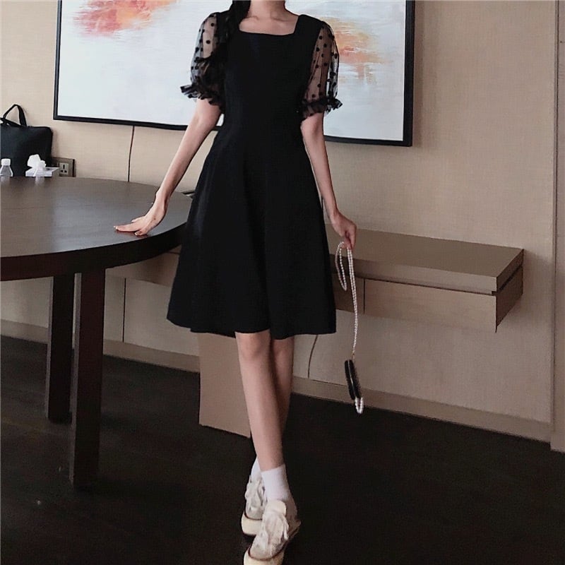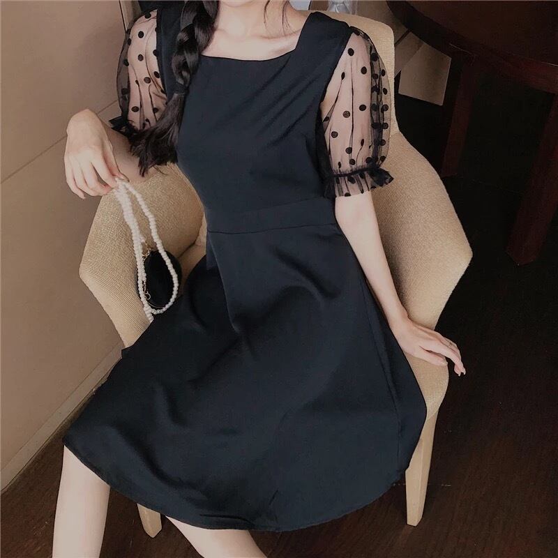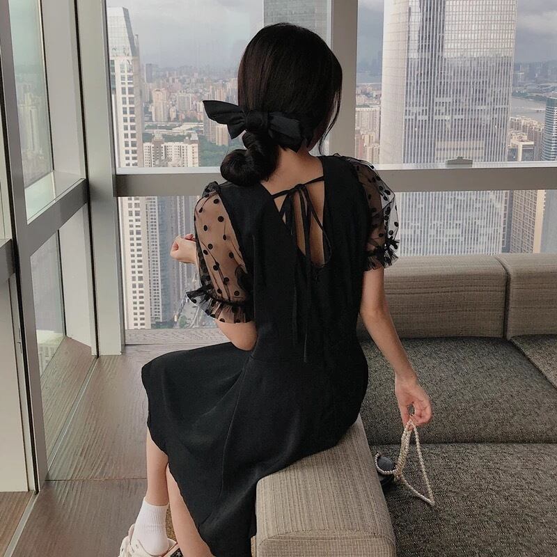 【 国内発送 d091 】ドットパフスリーブワンピース パフスリーブ ブラック 黒 大きいサイズあり S M L 2L 3L