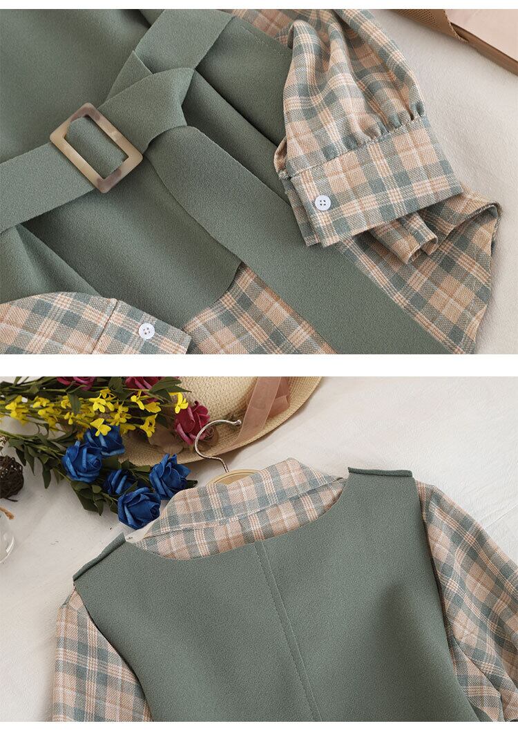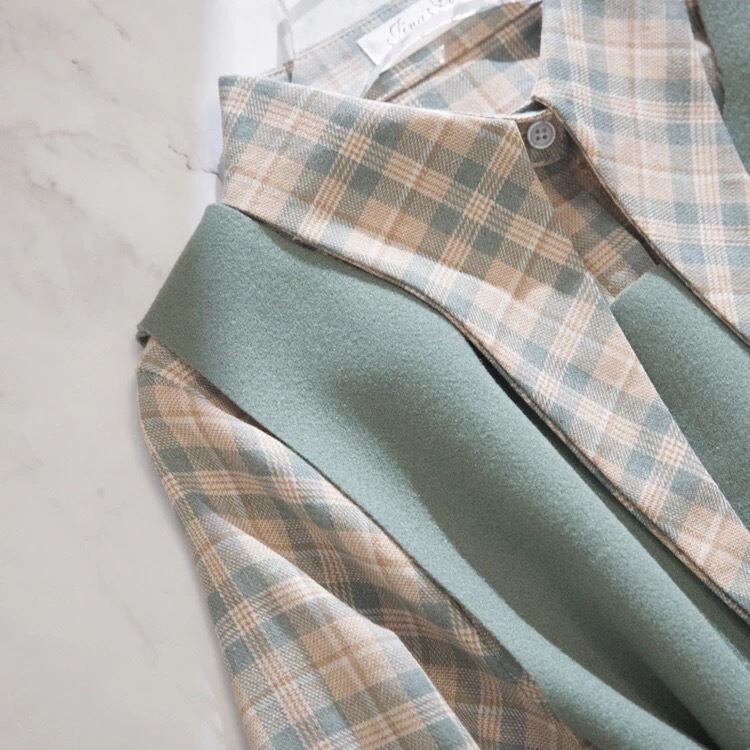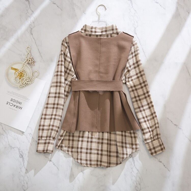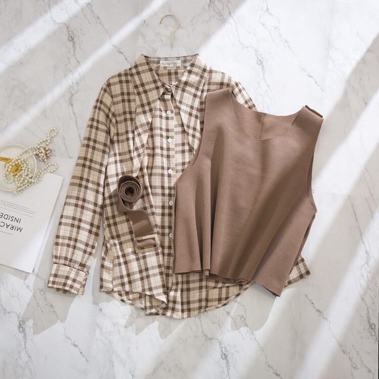 【 国内発送 t028 】チェックシャツ&ベスト セット 長袖シャツ 長袖ブラウス ベスト アンサンブル