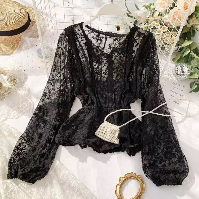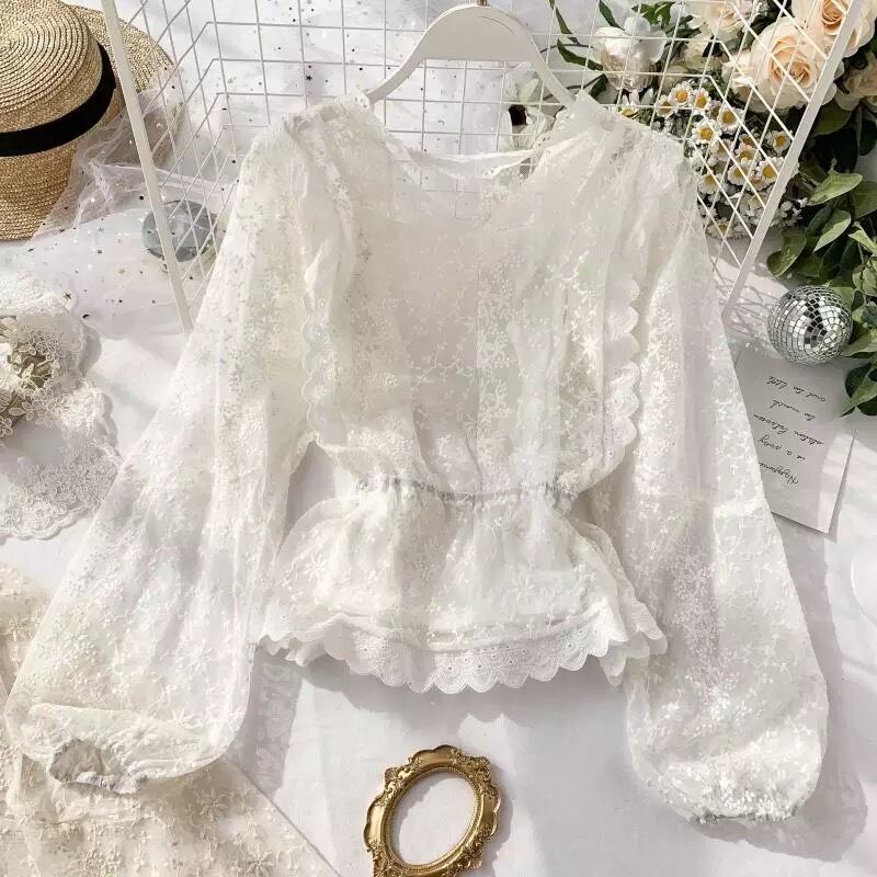 【 国内発送 t031 】リーフレースブラウス 長袖ブラウス 長袖シャツ アプリコット ブラック ホワイト