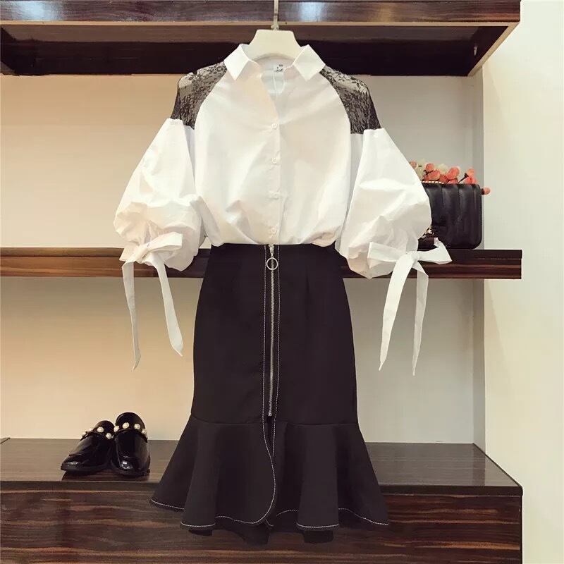 【 国内発送 s024 】ボリューム袖シャツ&マーメイドスカート セットアップ 大きいサイズ あり 体型カバー