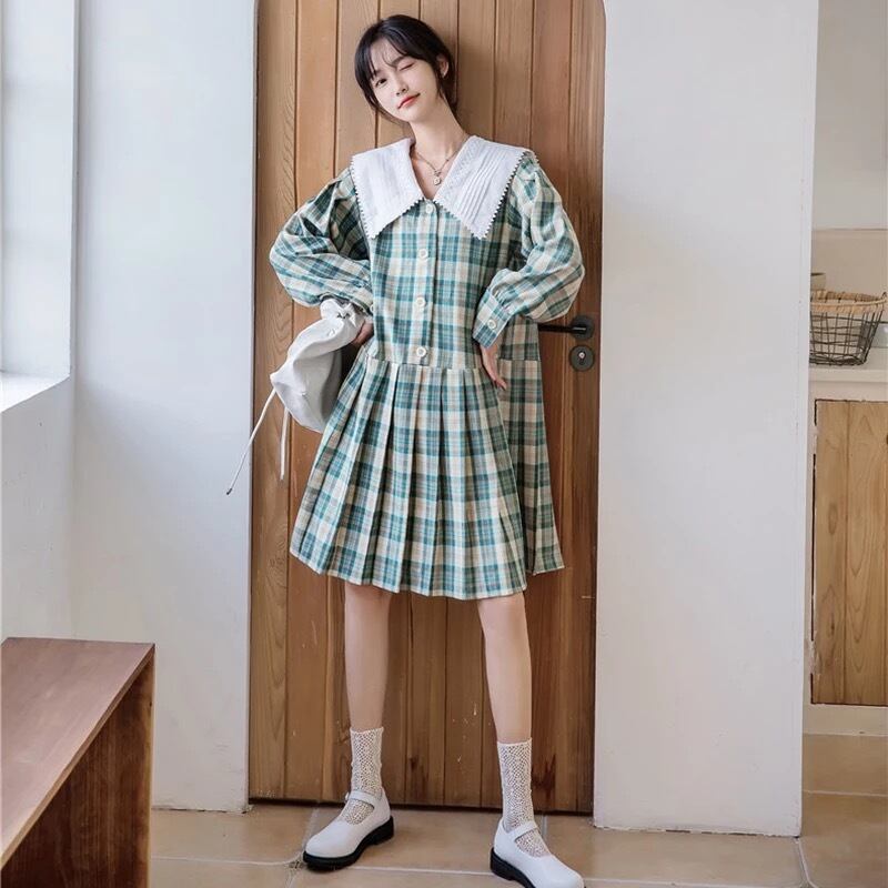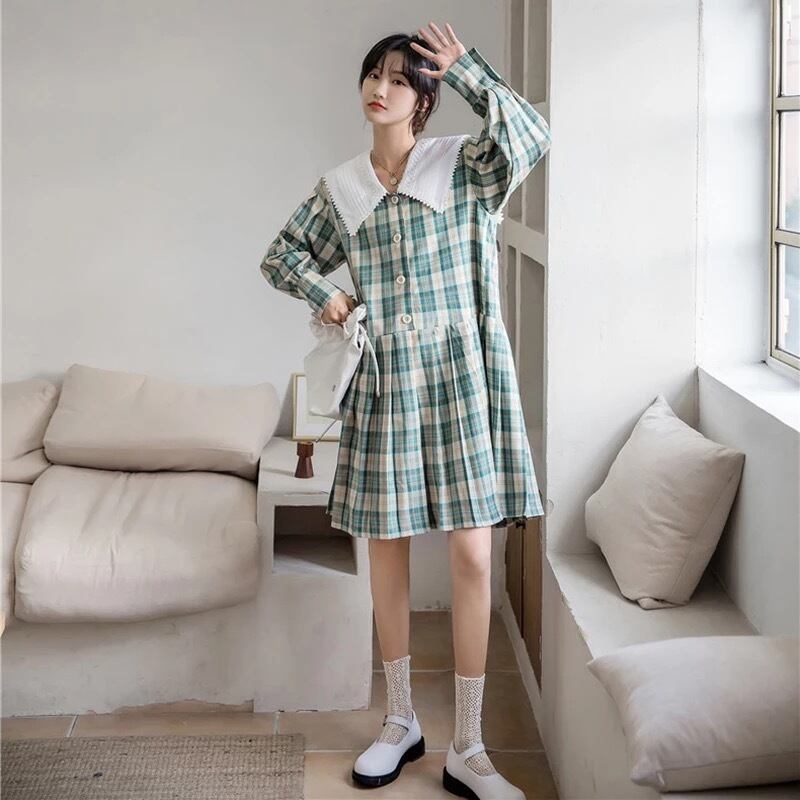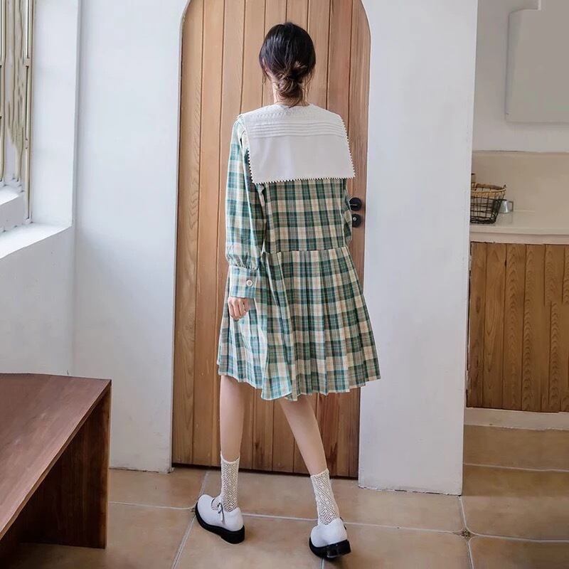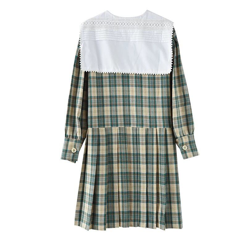 【 国内発送 d115 】グリーンチェックワンピース ひざ丈ワンピース レース襟 襟付きワンピース 長袖ワンピース