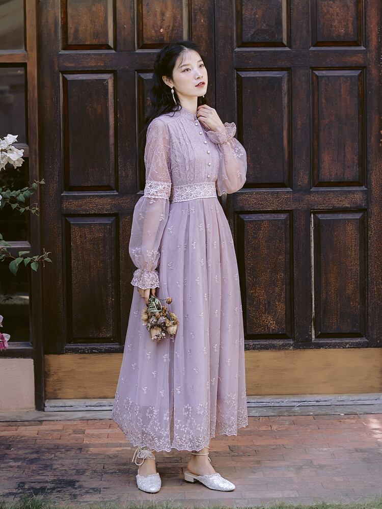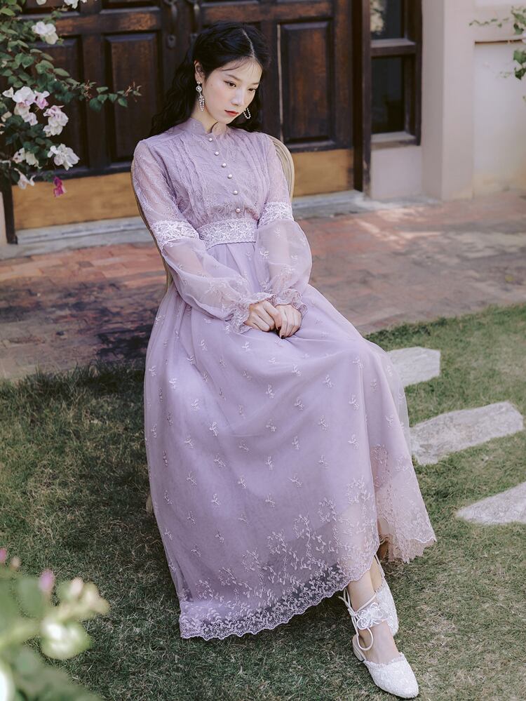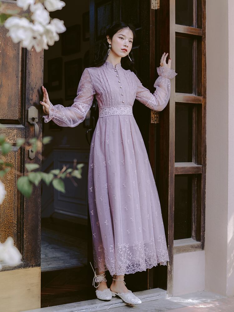 プチハイネックでトレンドを取り入れたラベンダーロングレースワンピース。