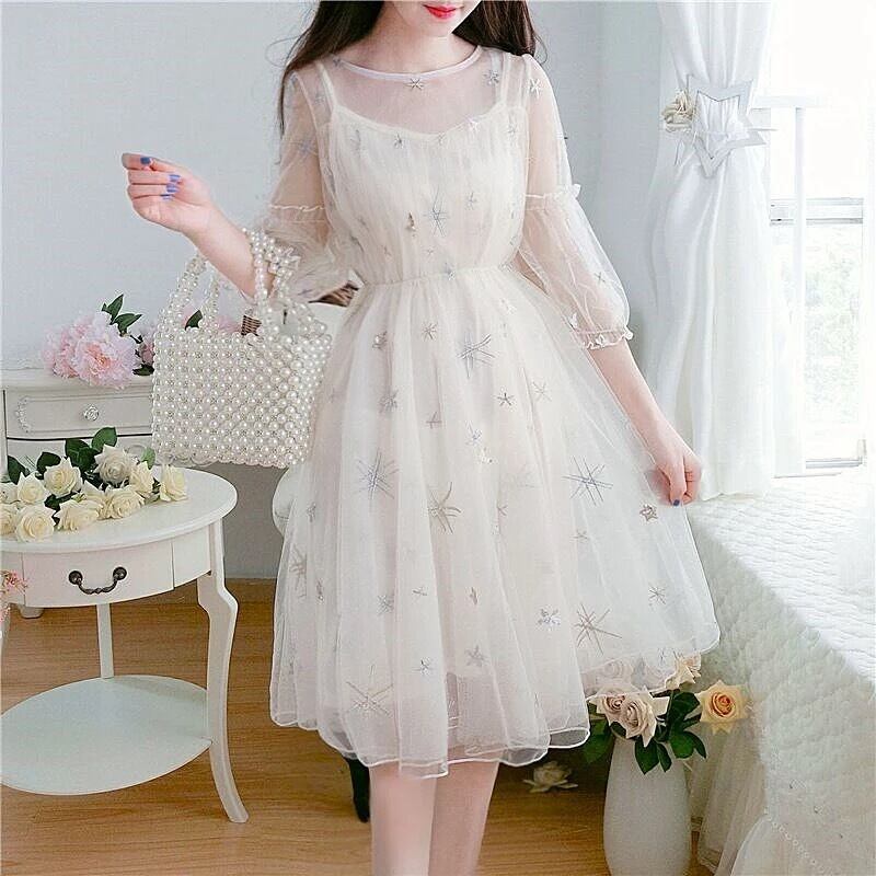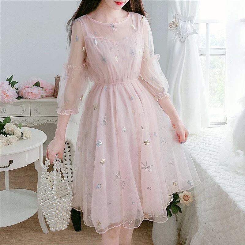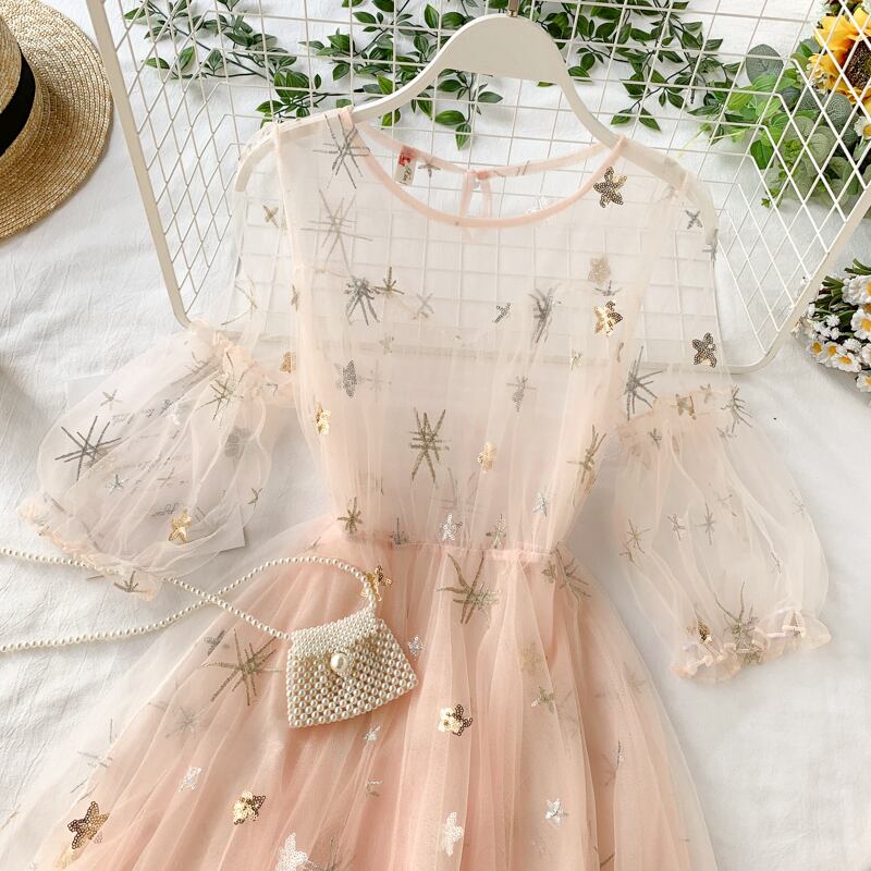 【 国内発送 d124 】シースルースターリーワンピース シースルーワンピース 七分袖ワンピース 秋ワンピース