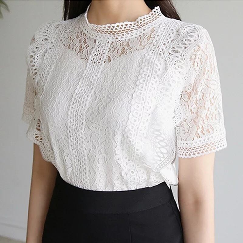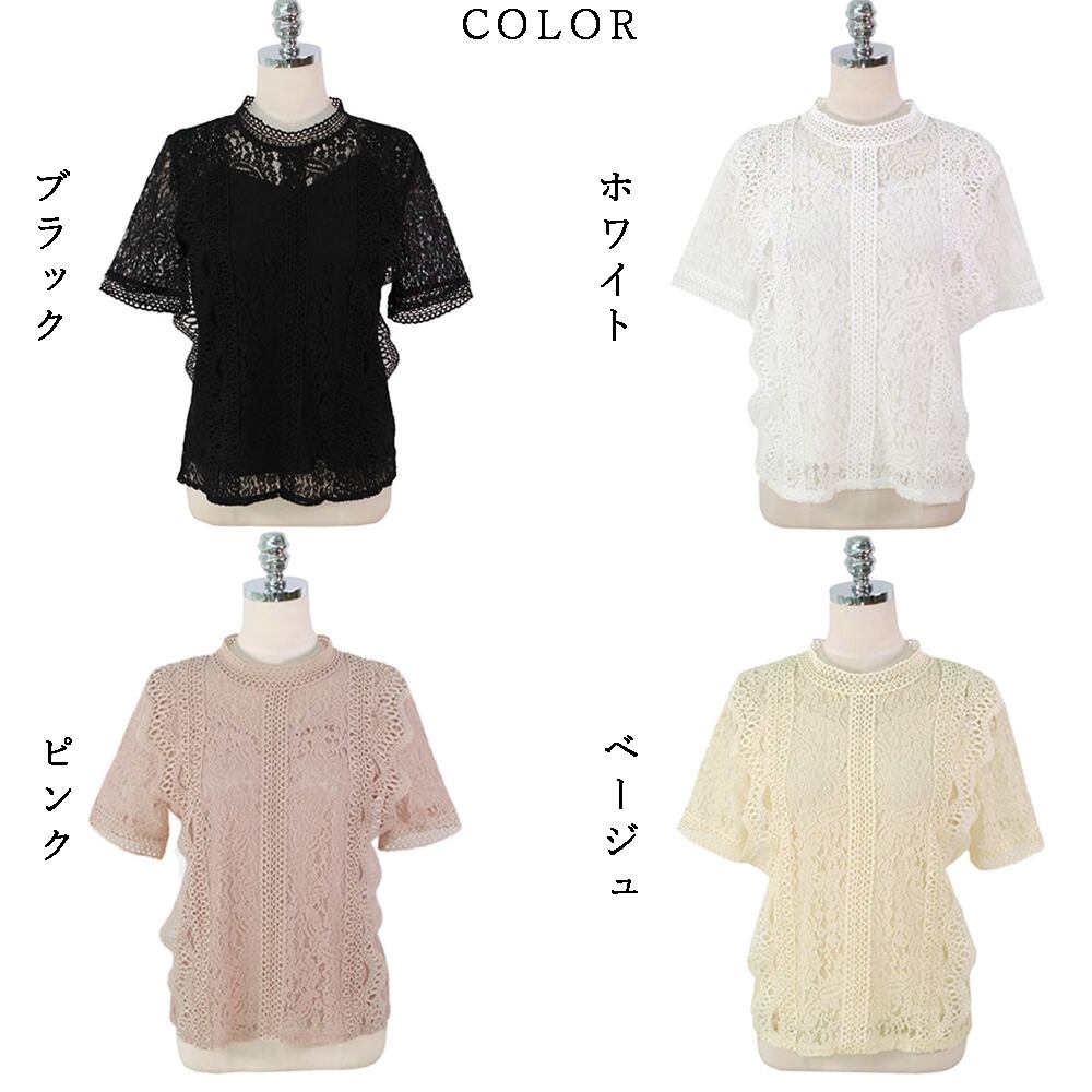 【 国内発送 t046 】半袖レースブラウス 総レースブラウス 半袖ブラウス ハイネックブラウス