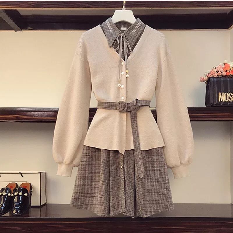 【 国内発送 s032】大きいサイズ ワンピース&ニットカーディガン チェック柄ワンピース ニット セーター カーディガン 秋 冬 秋冬 ナチュラル ブラウン