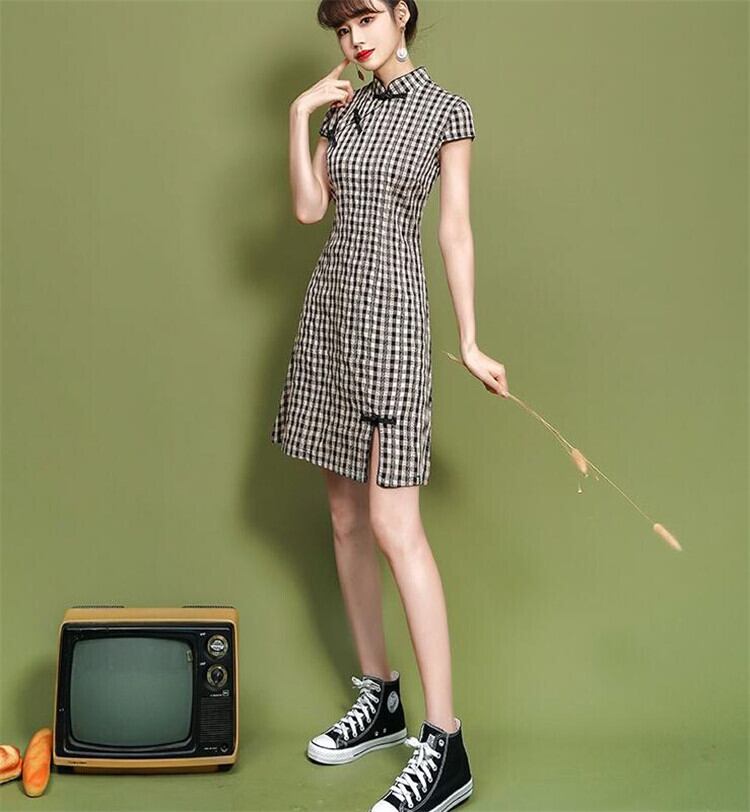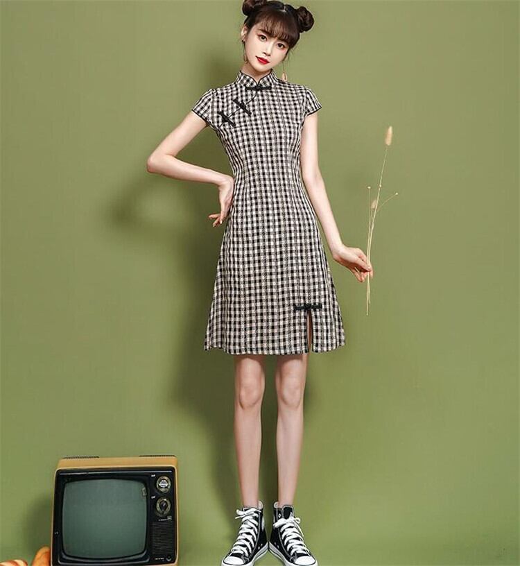【 国内発送 d134 】レトロチャイナ服 チェック柄チャイナ服 ミニワンピース ミニ丈