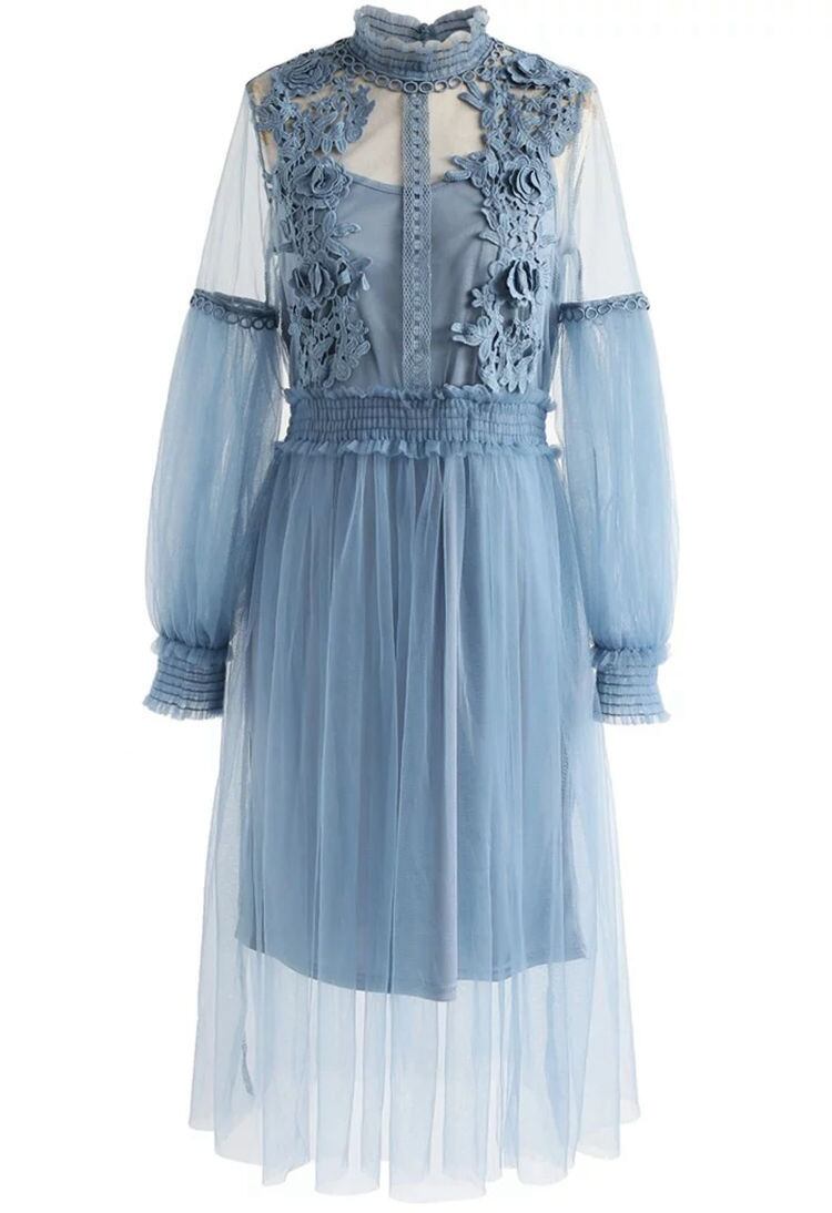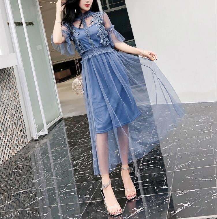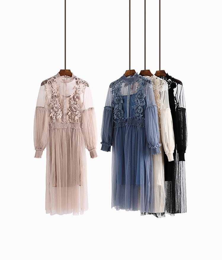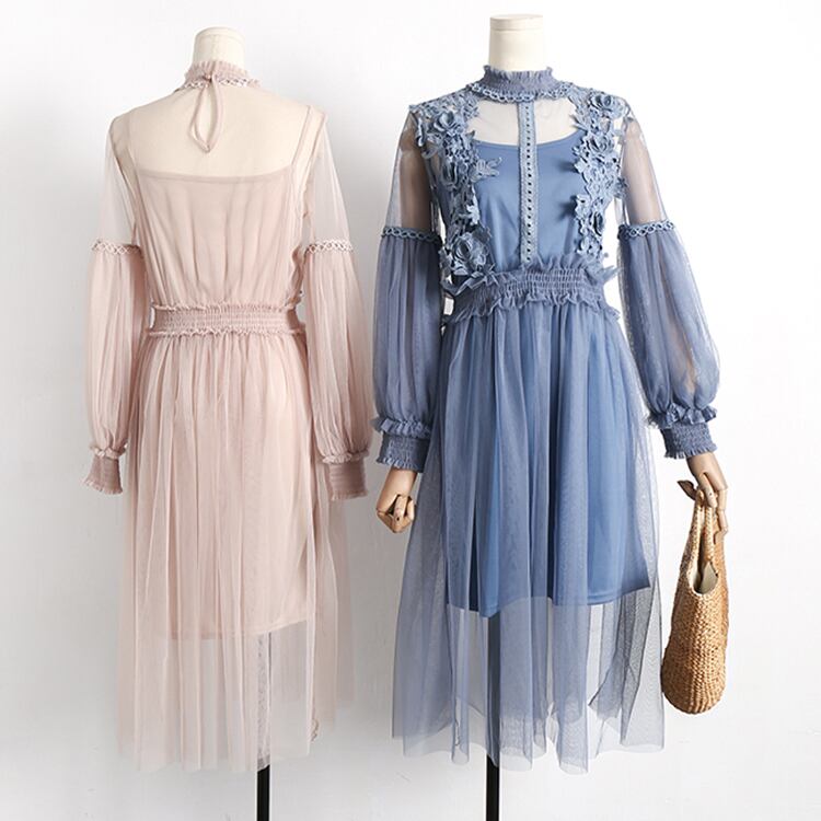 【 国内発送 d156 】レースチュールワンピース レースワンピース チュールワンピース バルーンスリーブ