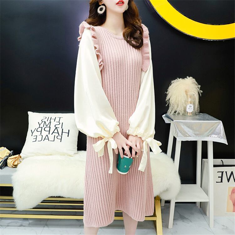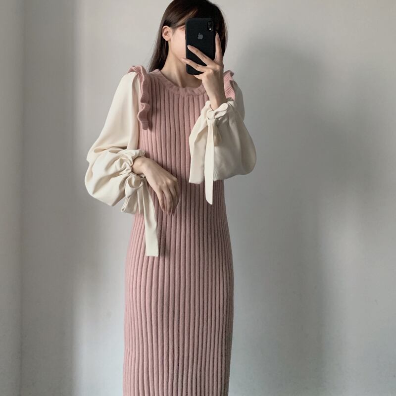 【 国内発送 d165 】フリルデザインニットワンピース ニットワンピ ミディアムワンピース ミモレ丈ワンピース