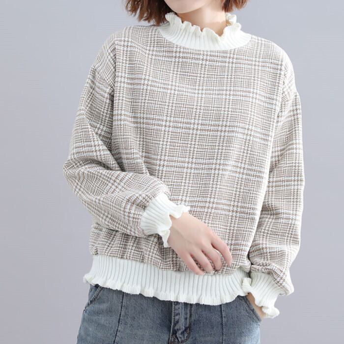【 国内発送 t084 】 フリルネックチェックスウェット チェック柄 フリル