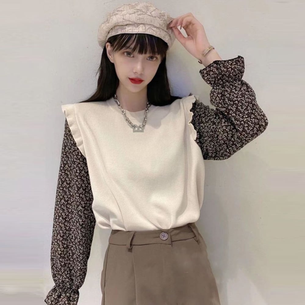 まるでフリル付きのオーバーサイズベストに小花ブラウスを重ね着したような1枚です。