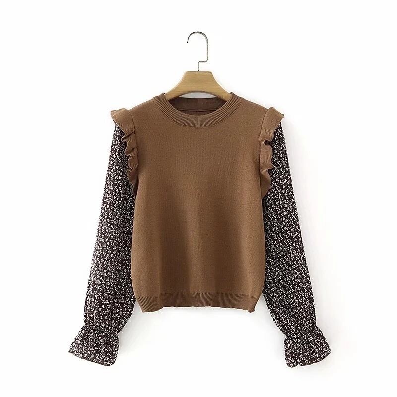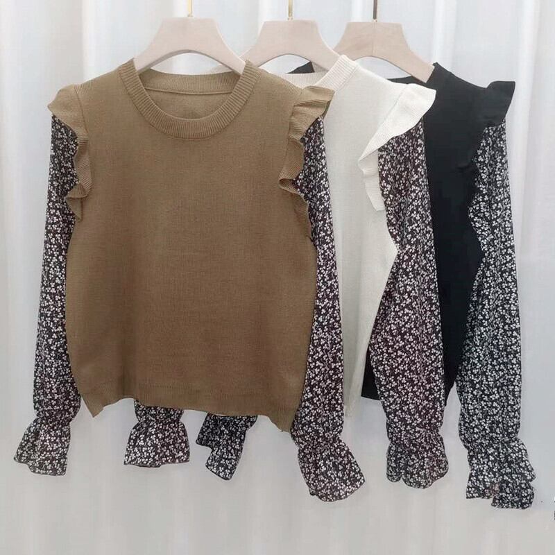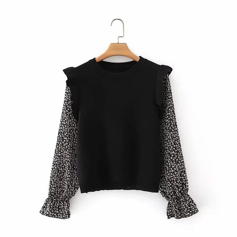 細かい花柄のボリュームある袖がドッキングしたニットプルオーバー。