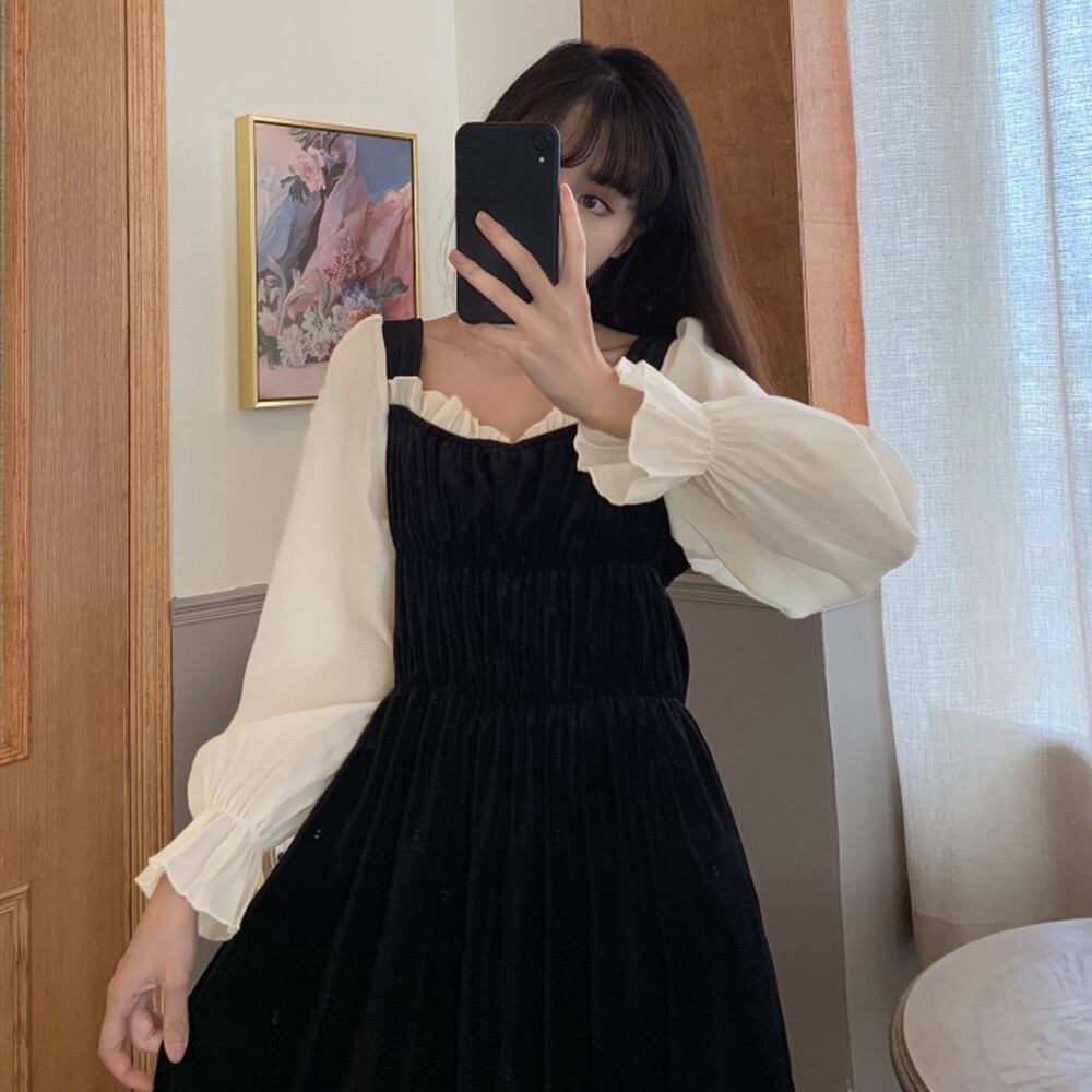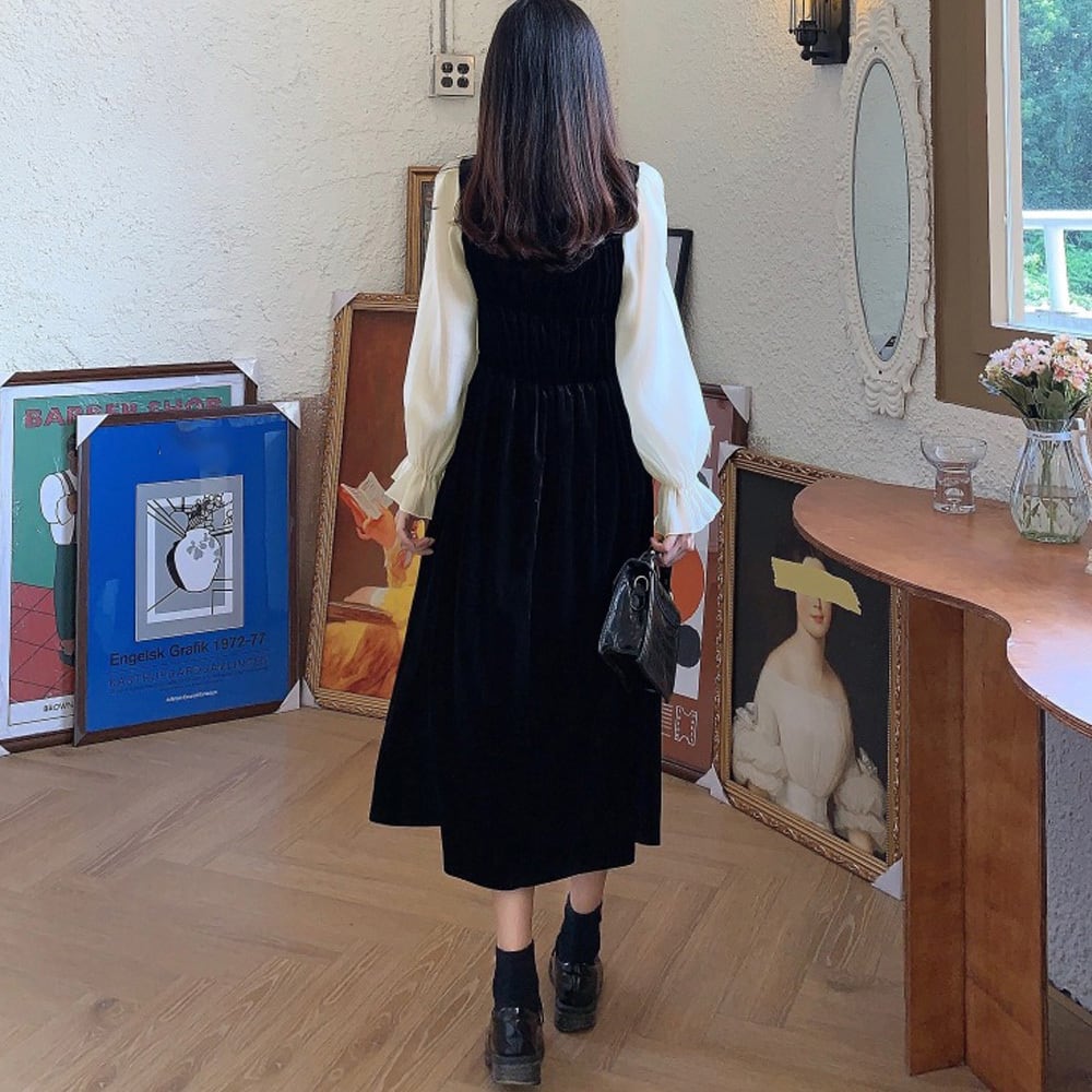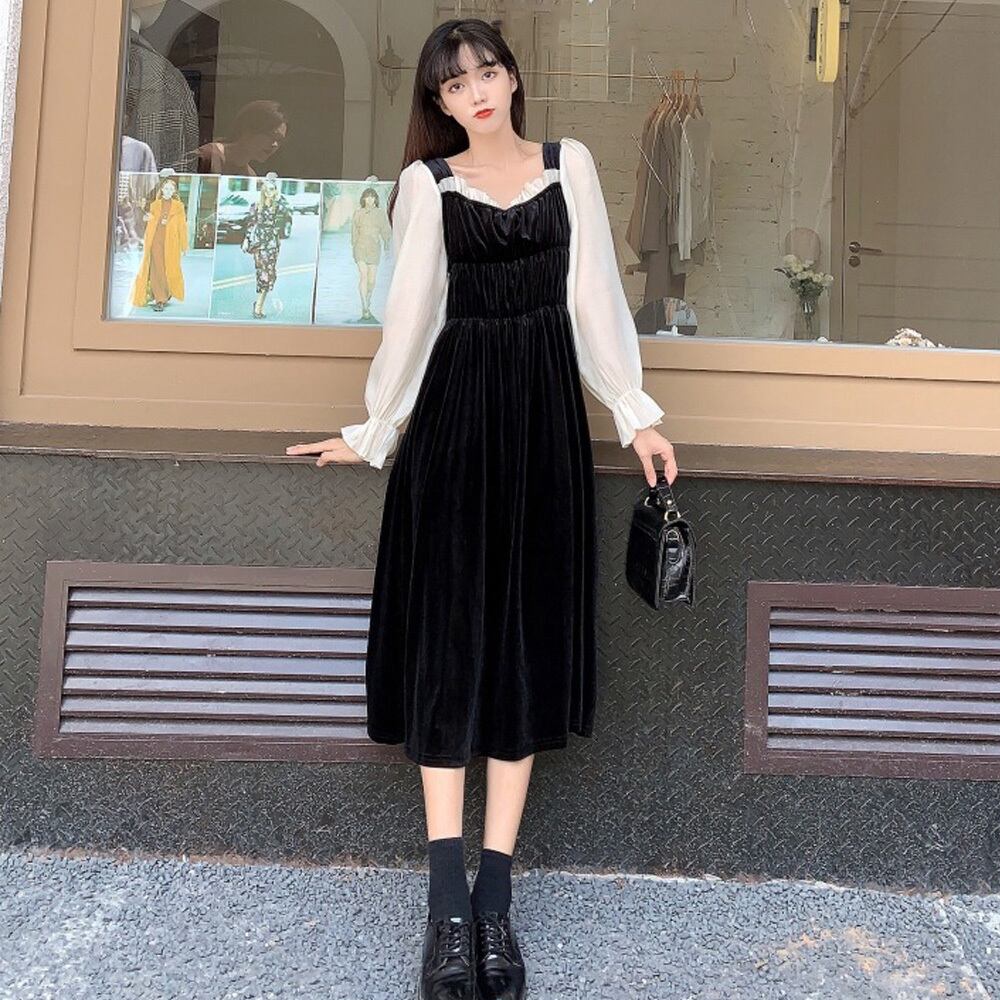 【 国内発送 d202 】ベロアロングワンピース ロングワンピース 韓国ファッション 重ね着風 異素材切替