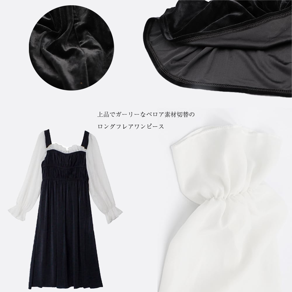 上品でガーリーなベロア素材切替のロングフレアワンピース。