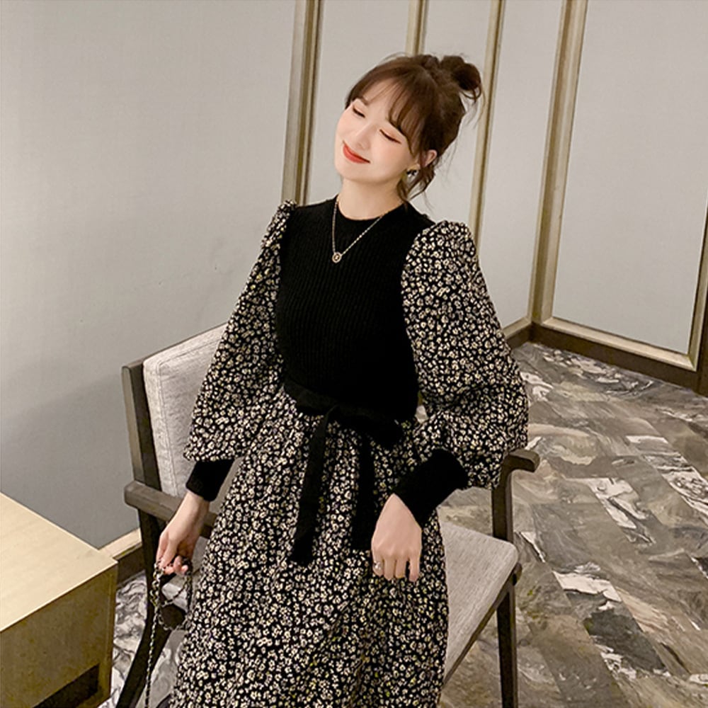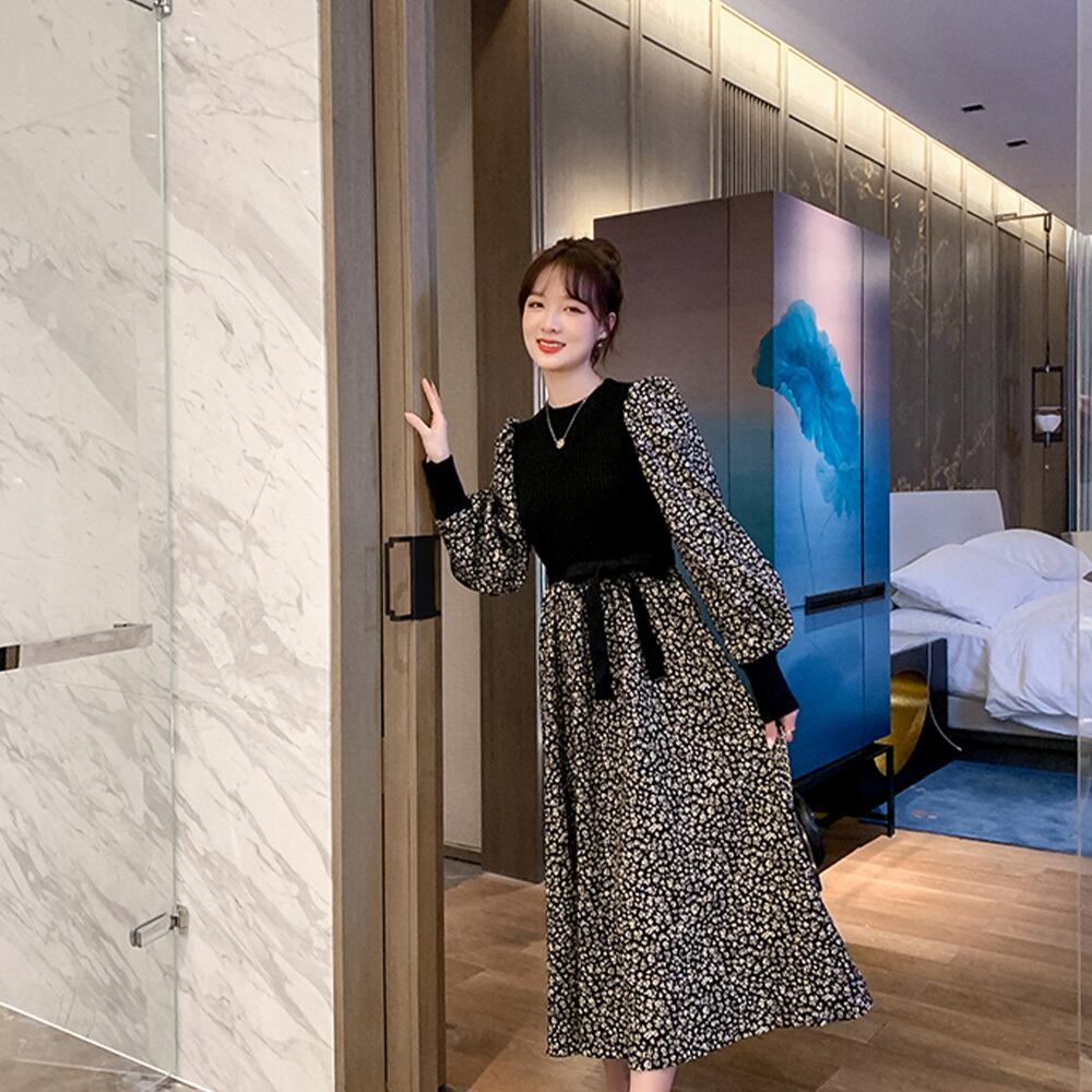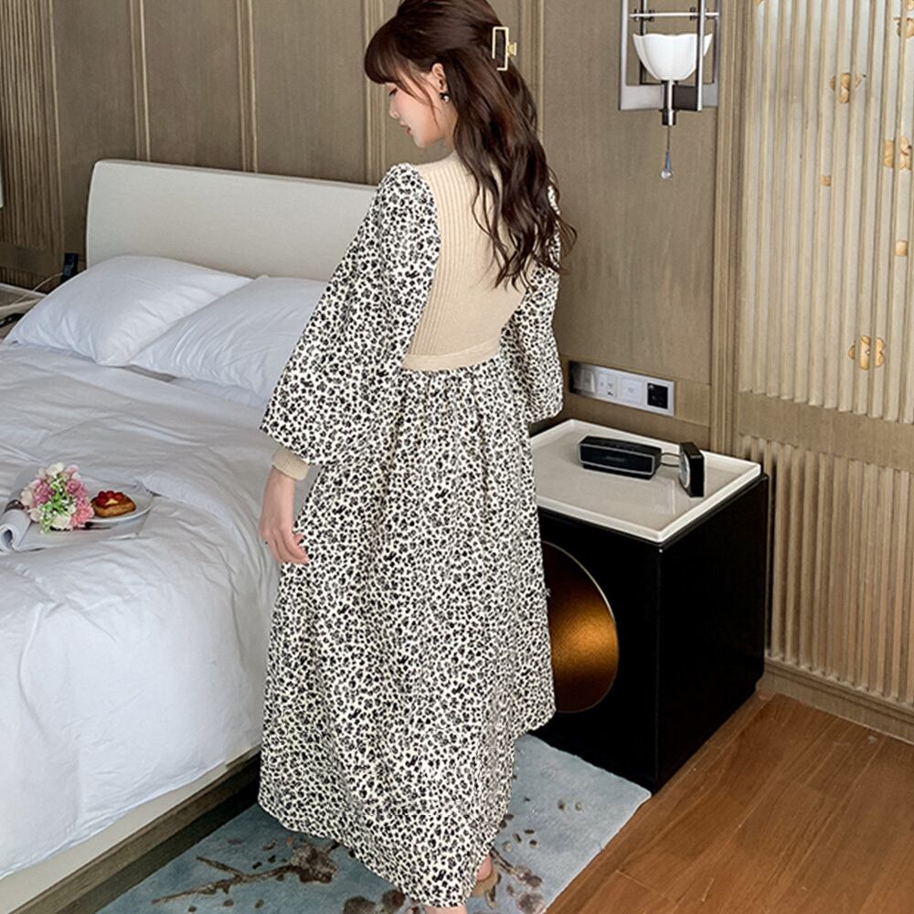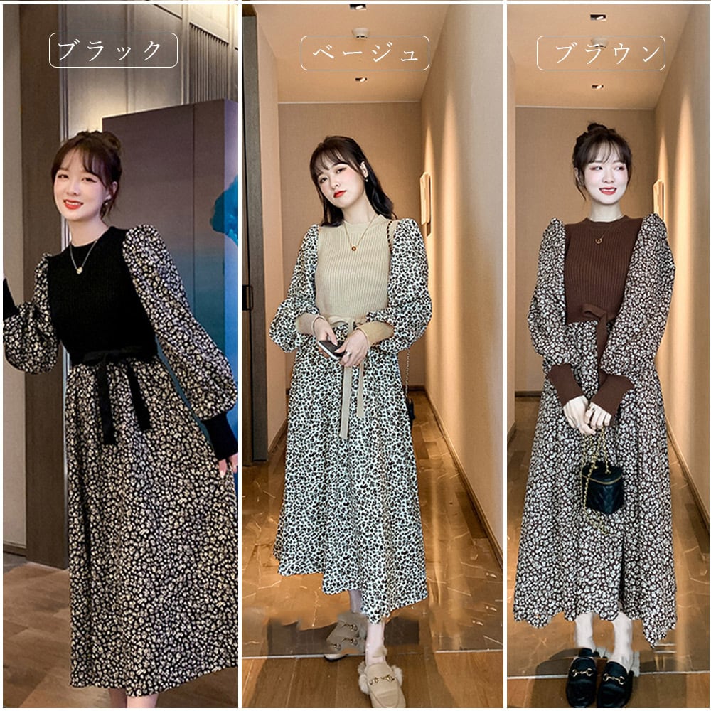 【 国内発送 d203 】ドッキングニットワンピース 切替 ロングワンピース 花柄ワンピース 長袖 春 秋 冬