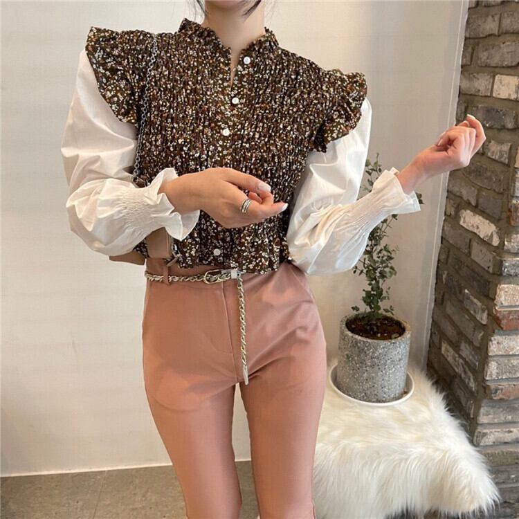 【 国内発送 t126 】フラワーパフスリーブシャツ ブラウス シャツ 花柄 ガーリー 韓国ファッション
