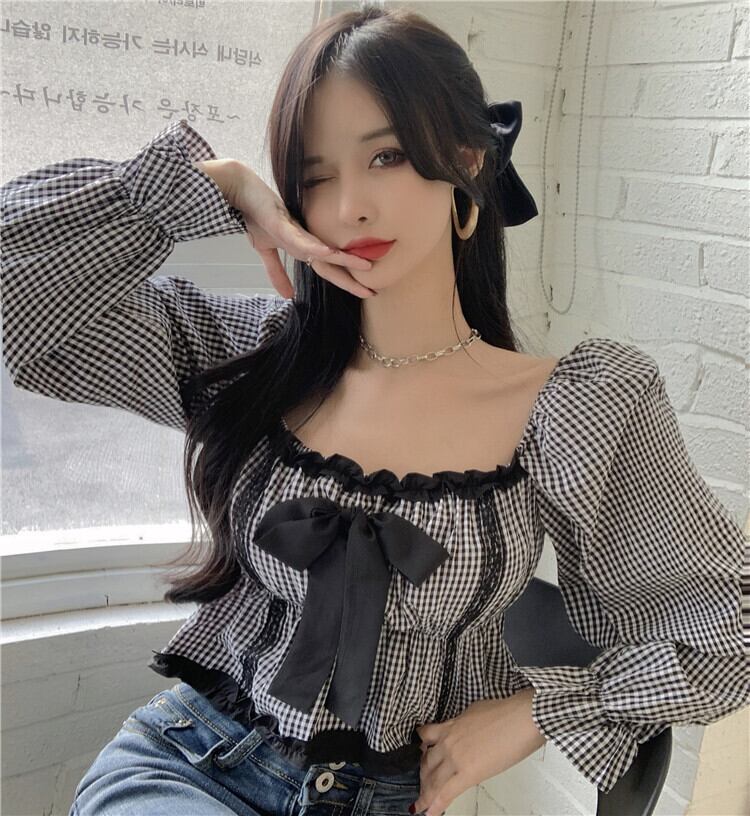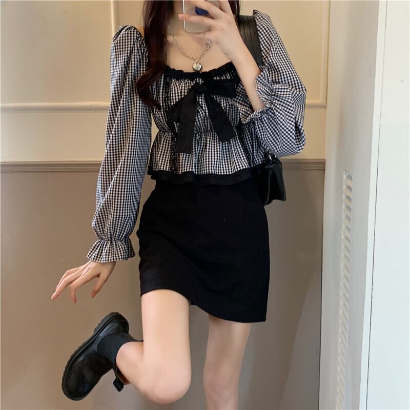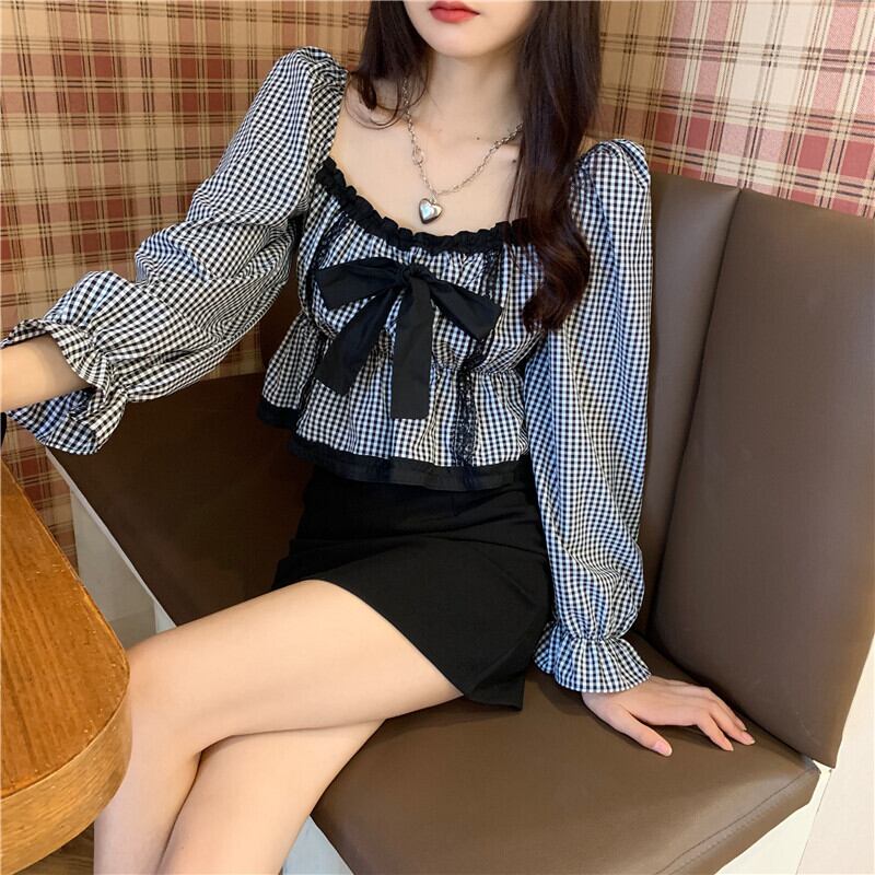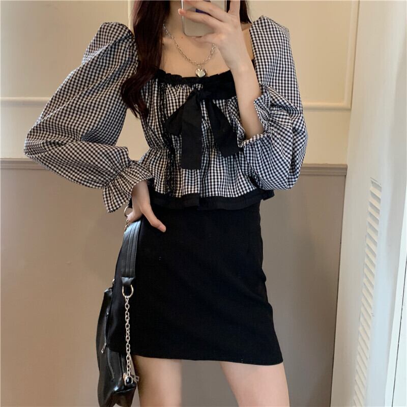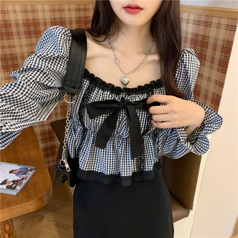 【 国内発送 t133 】大きいサイズあり!リボンチェック柄ブラウス S M L 2L 3L 4L 5L