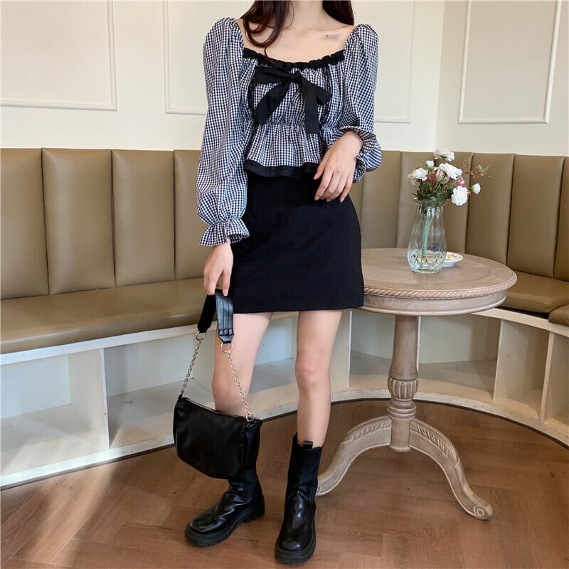 チェック柄のリボンブラウスです。