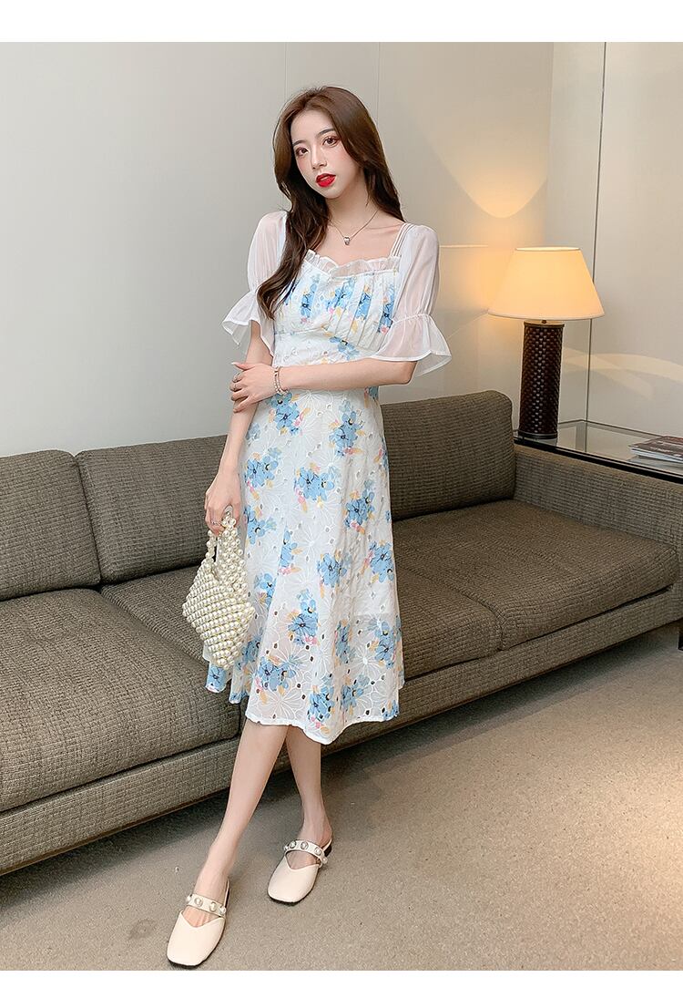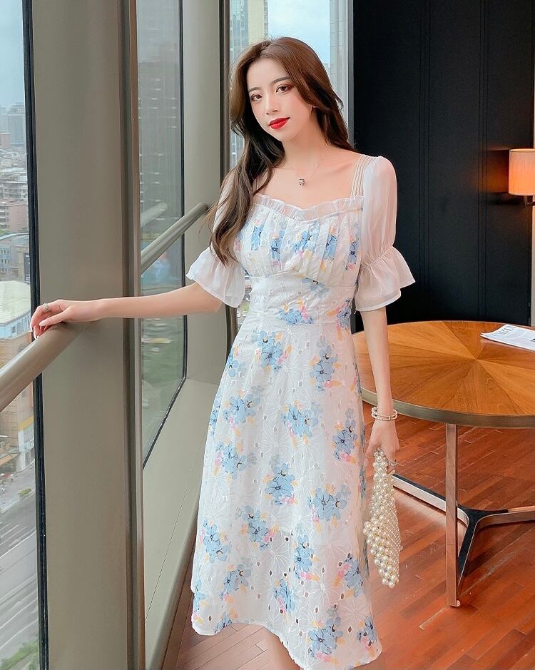 【 国内発送 d224 】バックリボン花柄プリントワンピース 膝下 ワンピース カジュアル 清潔 夏 爽やか