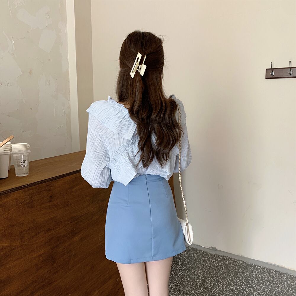 【 国内発送 s068 】大きいサイズあり シワ加工トップス&イレギュラースカート セットアップ イレギュラーヘム 長袖 夏 カジュアル セット