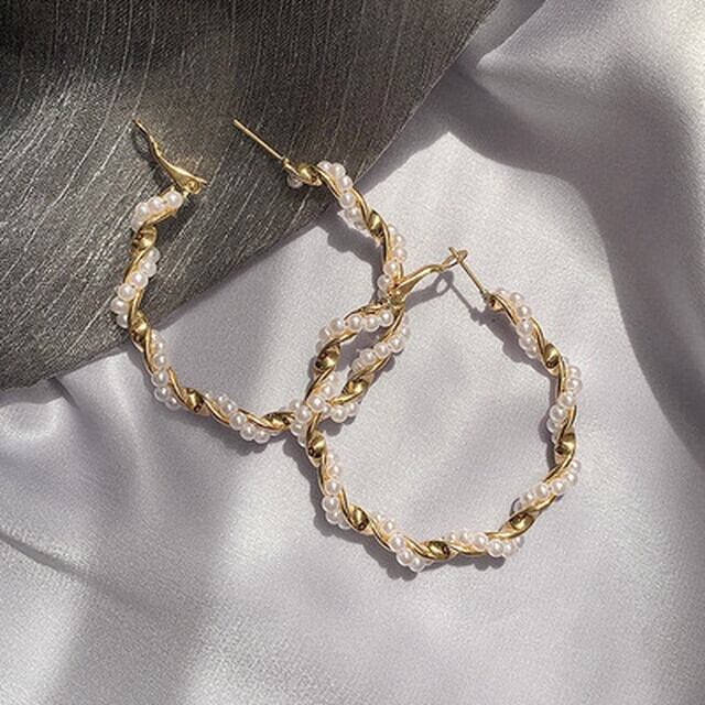 可愛いけど大人っぽい小さいパールのラインがツイストしていてゴールドカラーのリング状にあしらわれたフォルムは華やかで明る おしゃれで洗練された印象の見た目。