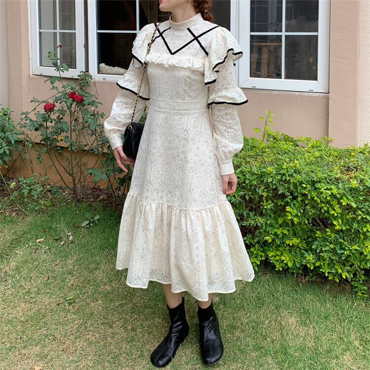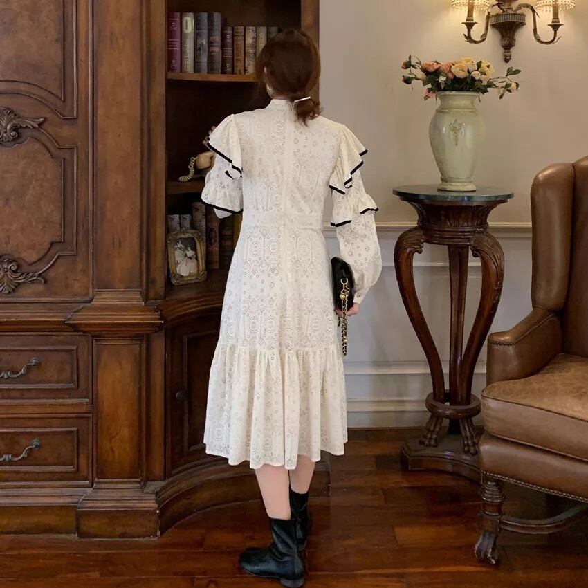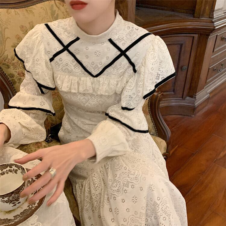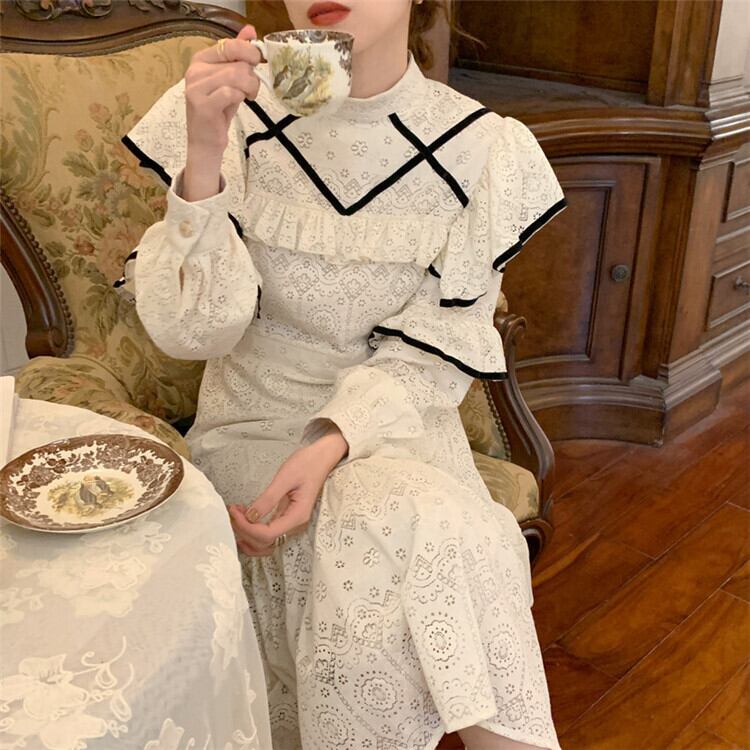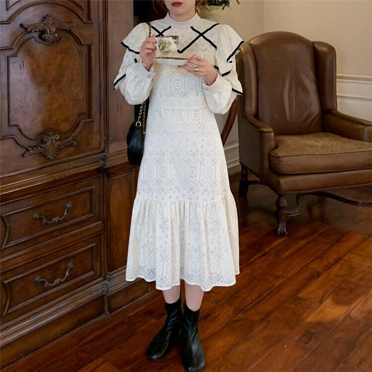 【 国内発送 d256 】透かし彫りワンピース ワンピース レディース 長袖 袖ありワンピース