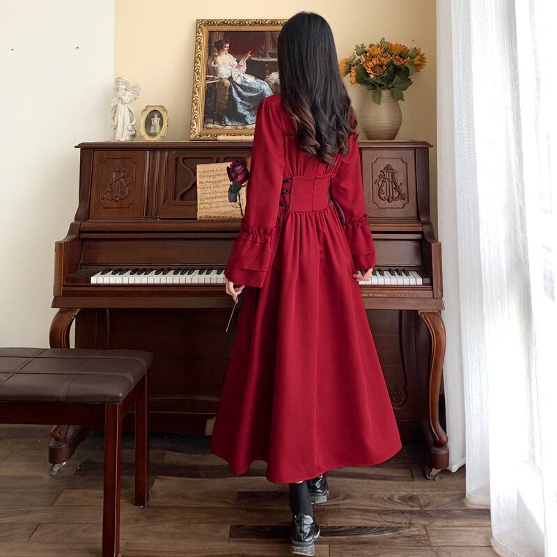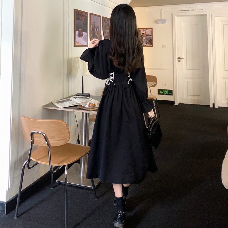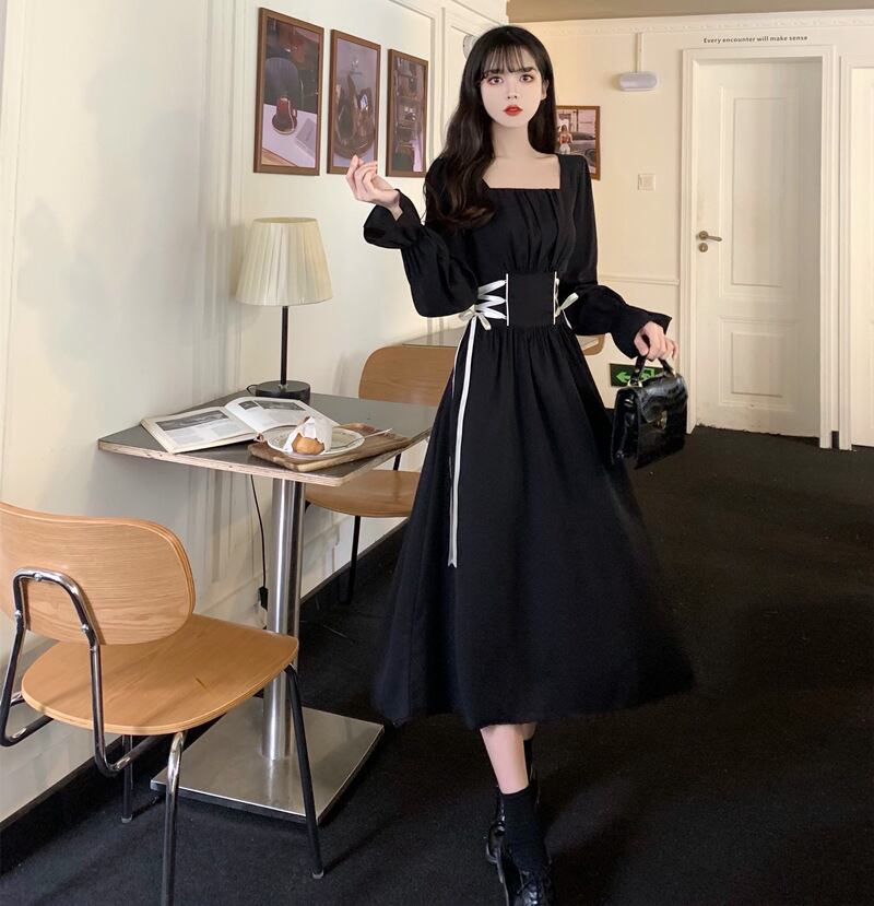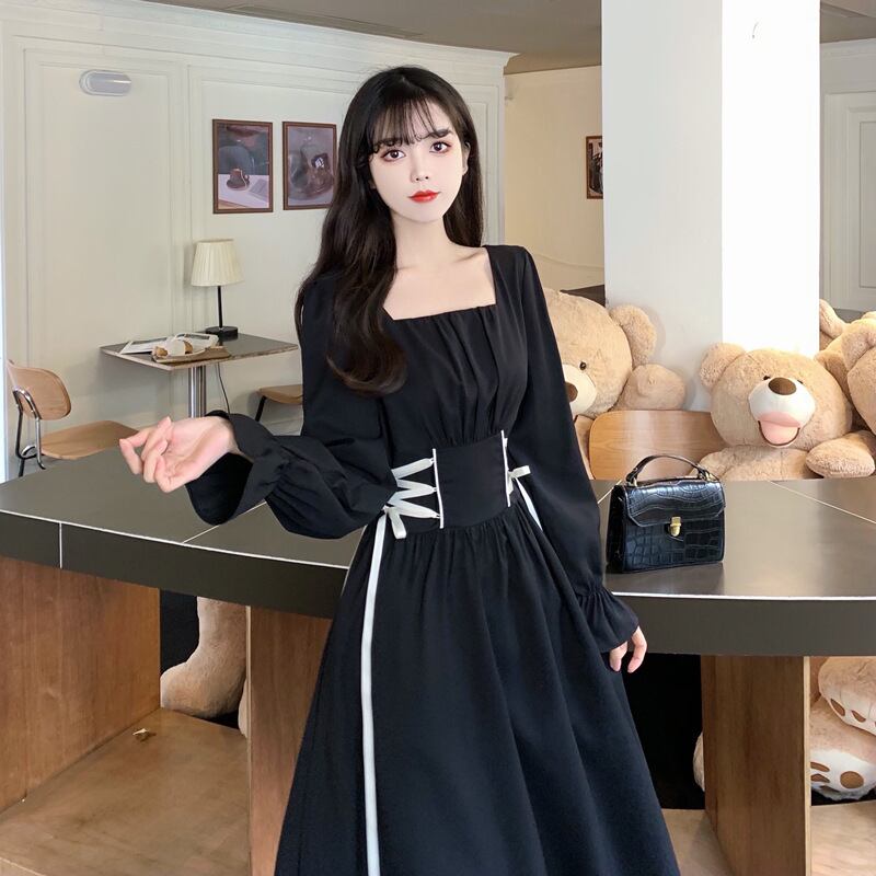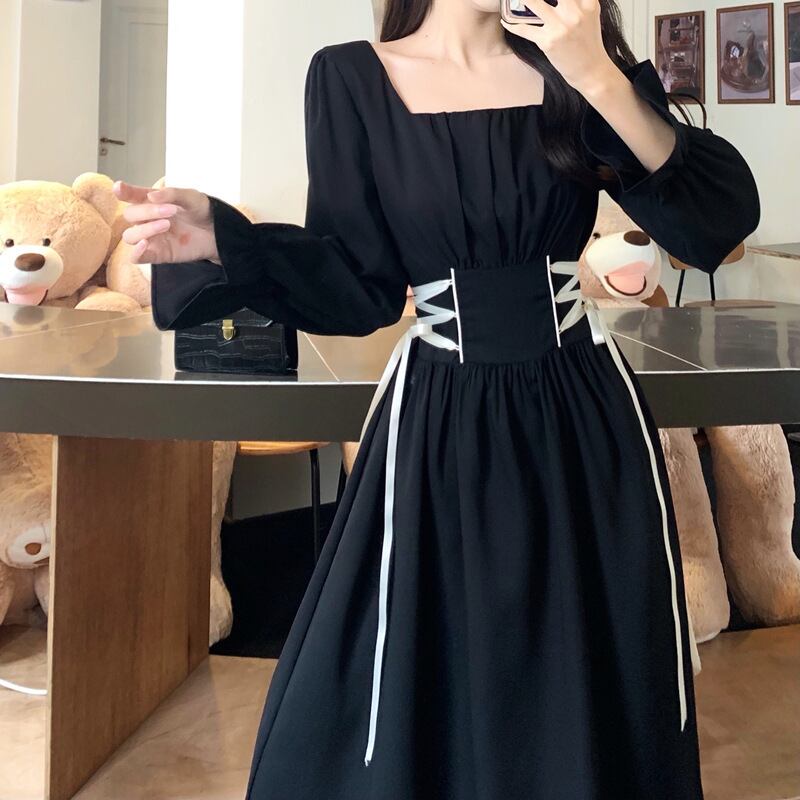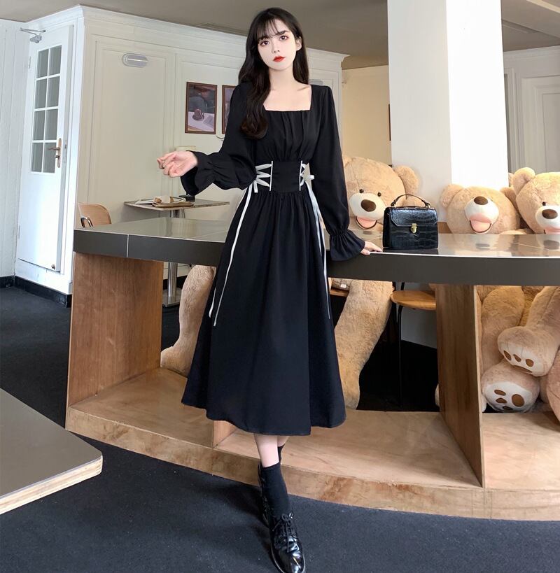 【 国内発送 d291 】大きいサイズあり ウエストリボンワンピース ワンピース レディース 長袖ワンピース スクエア